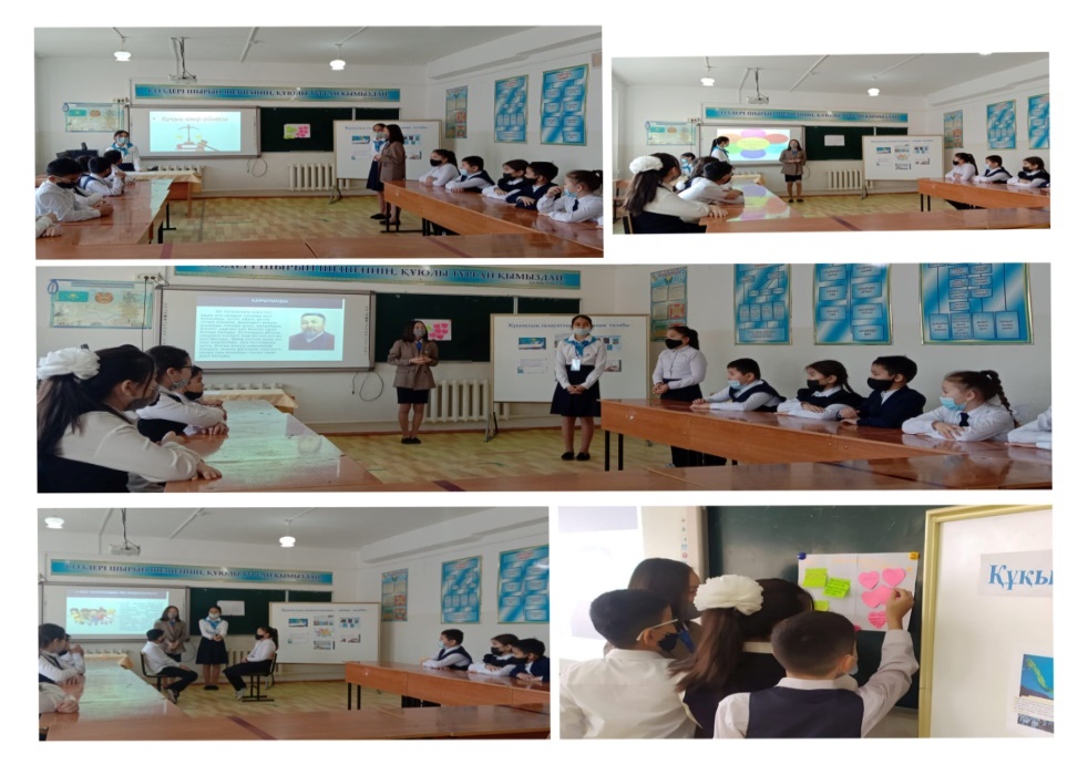 Ағымдағы жылдың 9 ақпан күні "Жас Ұлан" ұйым мүшесі Жаңбыр Сымбаттың ұйымдастыруымен 5 "а" сынып оқушыларының қатынасуымен "Құқық - өмір айнасы" атты тәрбие сағаты өтті. Мақсаты: Жастардың құқықтық салауаттылығын арттырып, құқық бұзушылық және қылмыс белгілерімен, түрлерімен таныстыру, жасөспірімдердің құқықтары мен міндеттерімен таныстыру. Қоғамның заңдары мен нормаларын