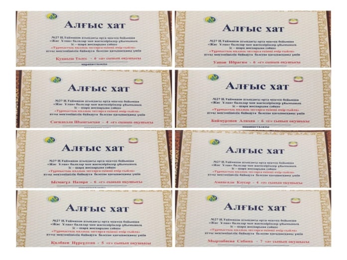 "Жас Ұлан" бірыңғай балалар мен жасөспірімдер ұйымына 10 жыл: айқын мақсат, межелі бағыт, көшбасшы тұлғасын қалыптастыру тақырыбындағы ұйым көшбасшылары мен жетекші-тәлімгерлерге арналған ағымдағы жылдың 13 қазан күні болған слетке қатысқаны үшін Атырау қаласы №27 И.Тайманов атындағы орта мектебінің тәлімгері Мұхамбет Әсемгүл Мақсотқалиқызы алғыс хатпен және мектептің "Жас Ұлан" ББЖ ұйымының белсенді мүшелері "Жас Ұлан " ББЖҰ ҚБ-нің төрайымы Мартагүл Төлеуқызынан Алғыс хат және сертификаттармен марапатталды.