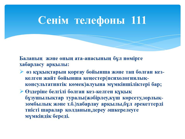 Балалар мен жастарға арналған бірыңғай Ұлттық сенім телефон желісін енгізу – қызметі, тәулігіне 24 сағат әр балаға ашық, өмірде қиын жағдайға тап болған балаларға жедел құқықтық және психологиялық көмек көрсете алады.