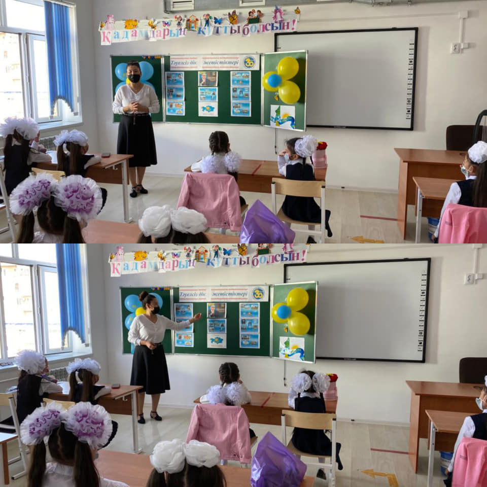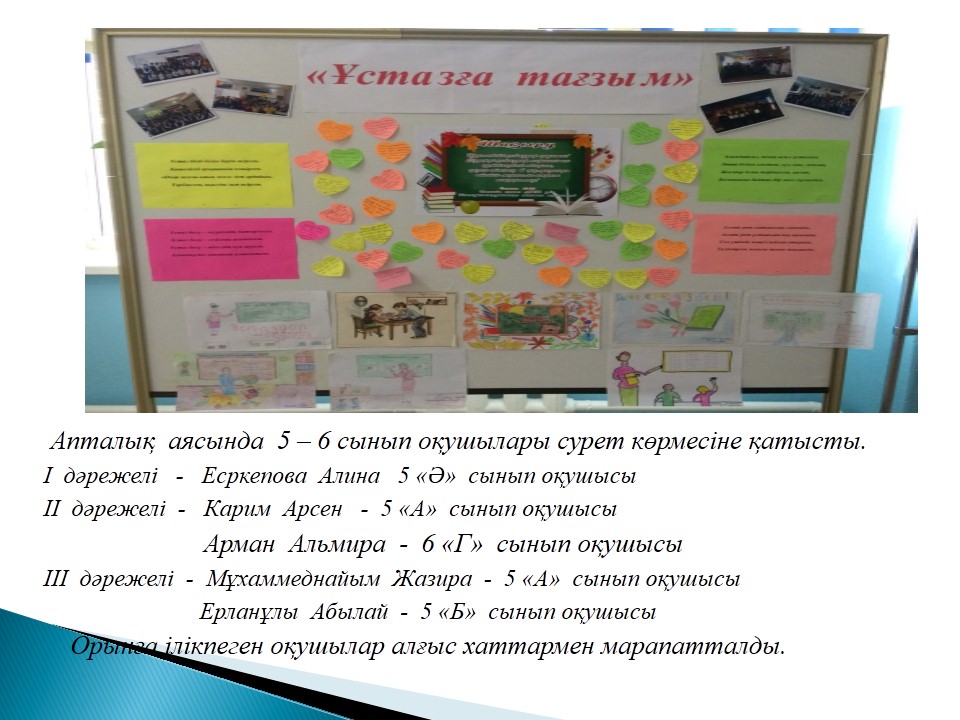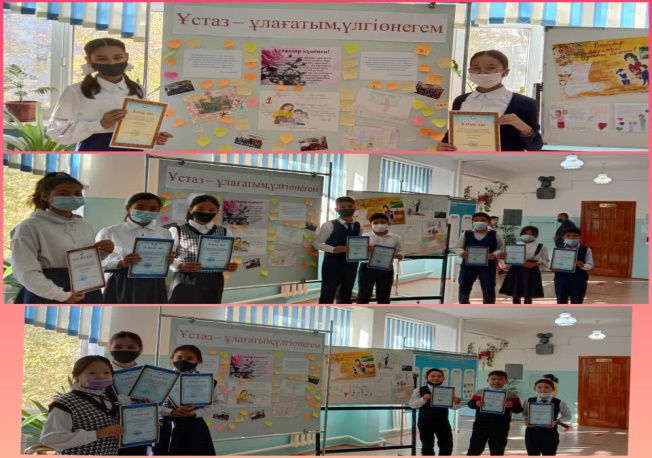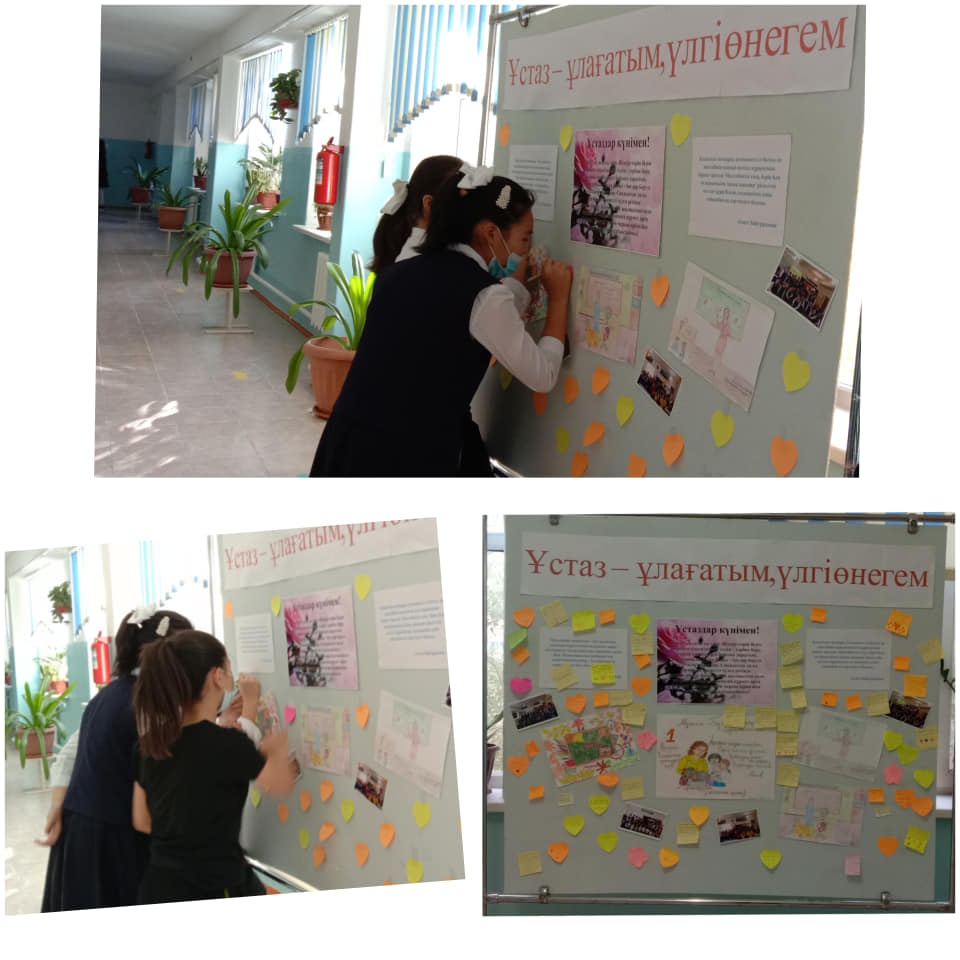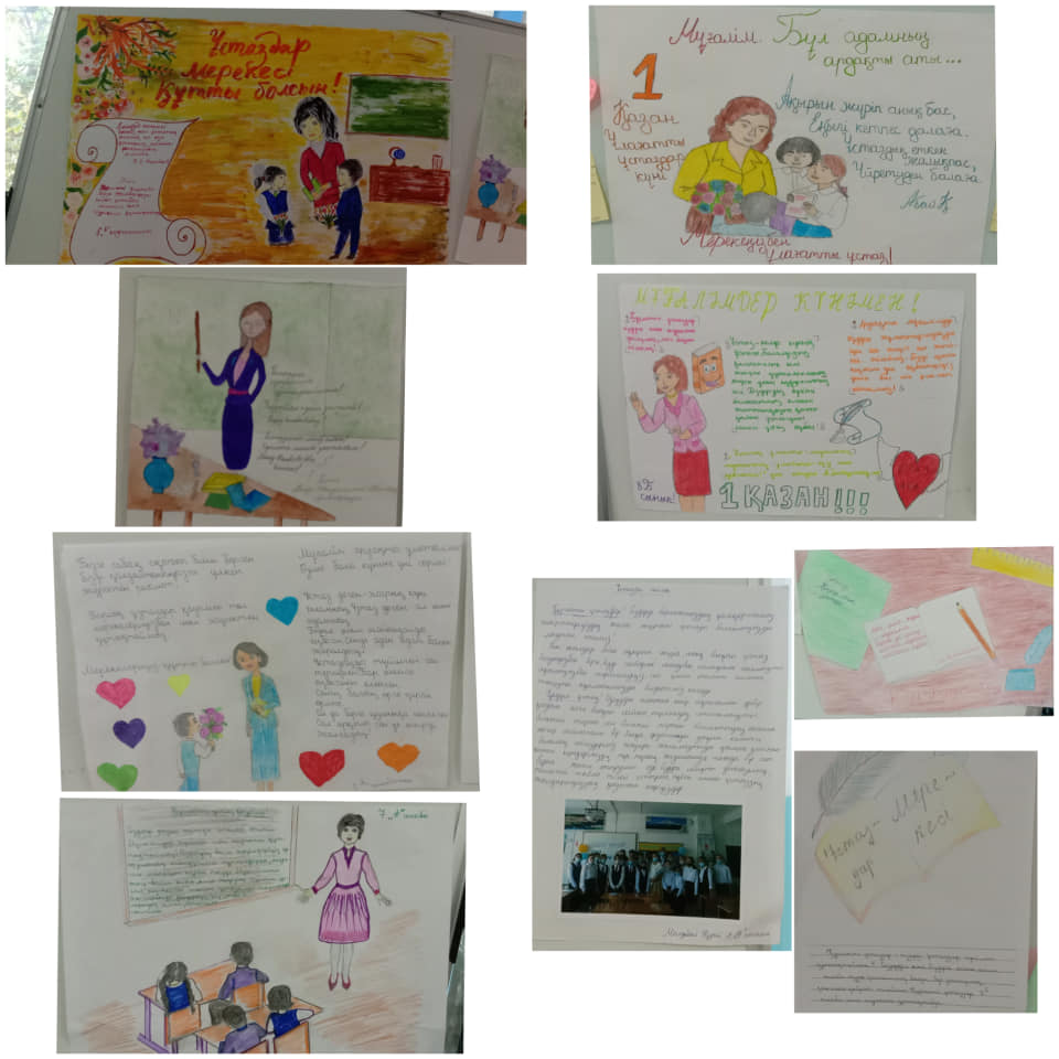 Атырау қаласы №27 И.Тайманов атындағы орта мектеп бойынша "Ұстаз - ұлағатым, үлгі өнегем" атты апталық аясындағы іс-шаралар жоспарына сәйкес сыныптарда сынып сағаттары, сурет көрмесі ұйымдастырылды.