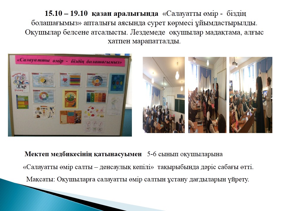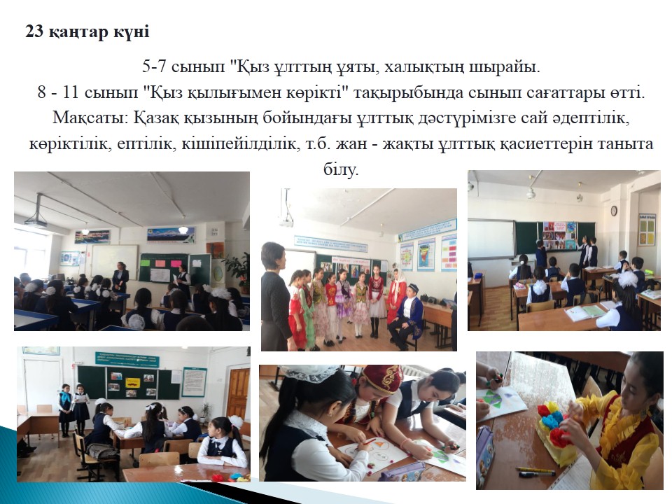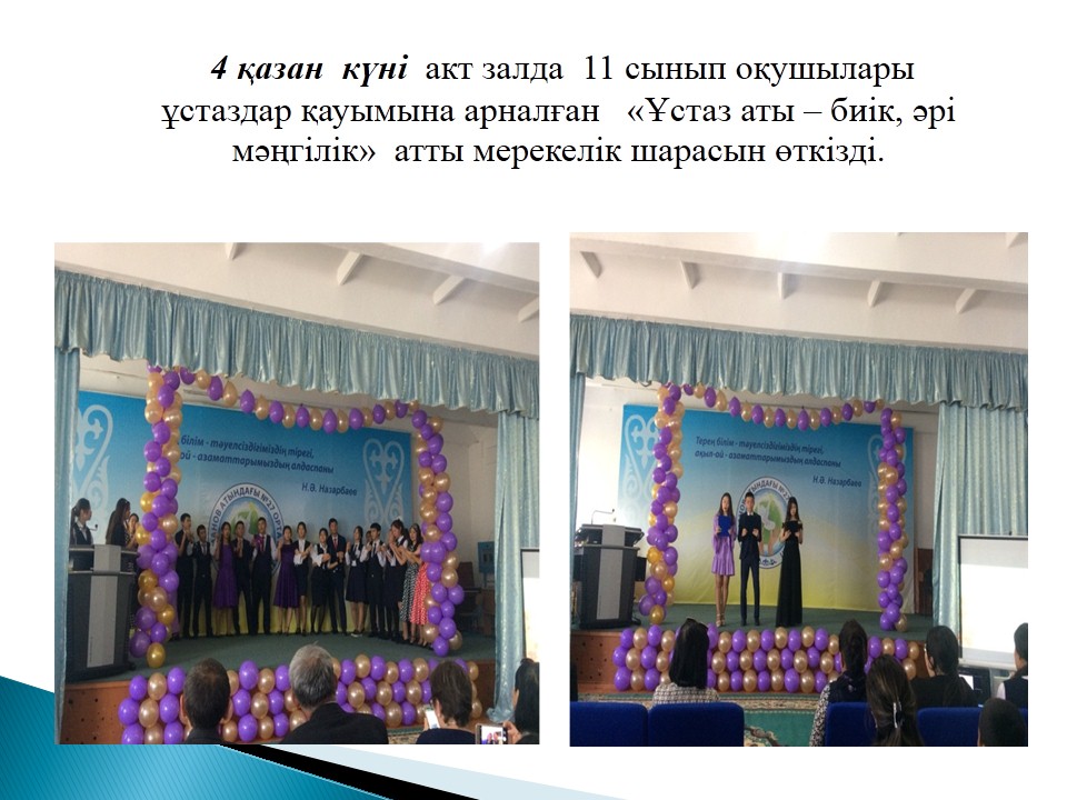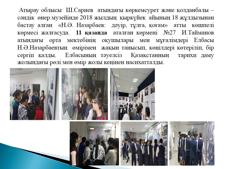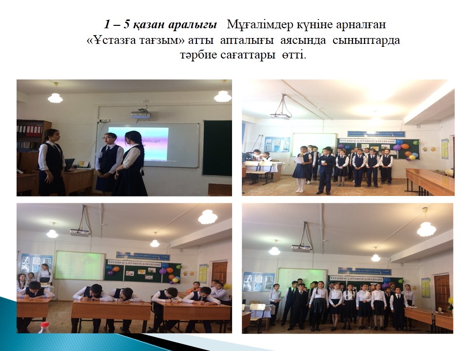 Атырау қаласы №27 И.Тайманов атындағы орта мектеп бойынша "Ұстаз - ұлағатым, үлгі өнегем" атты апталық аясындағы іс-шаралар жоспарына сәйкес сыныптарда сынып сағаттары, сурет көрмесі ұйымдастырылды.