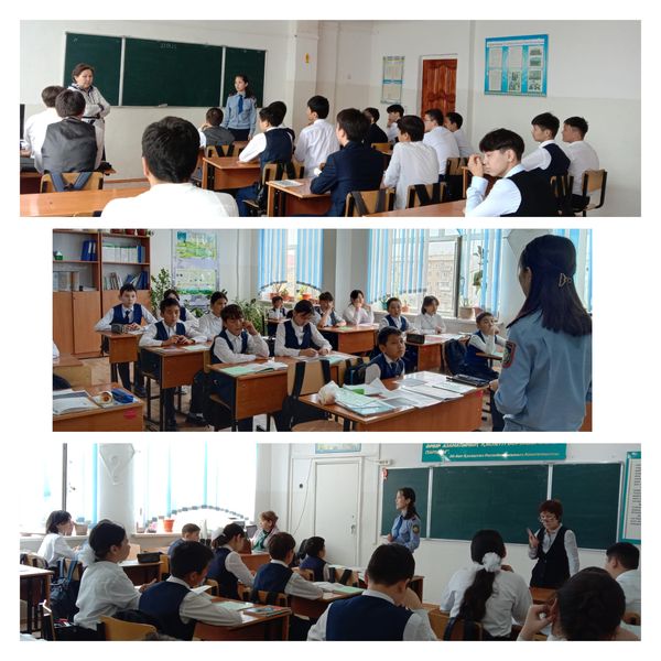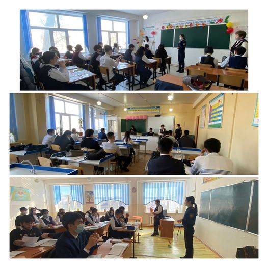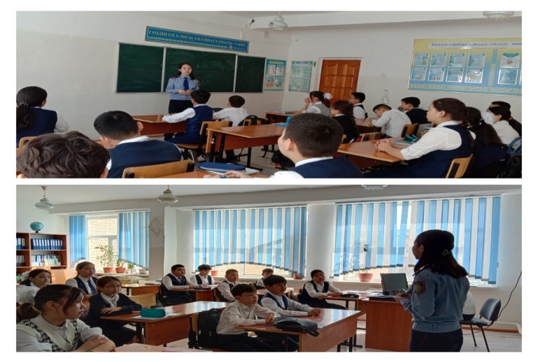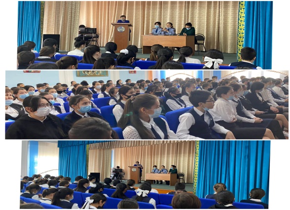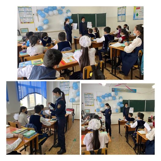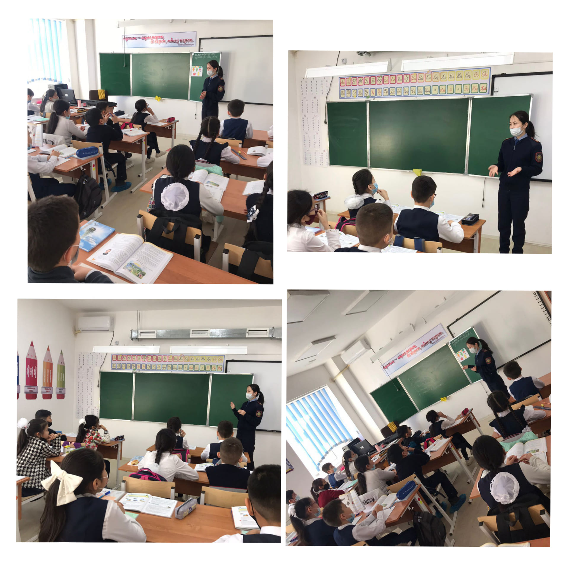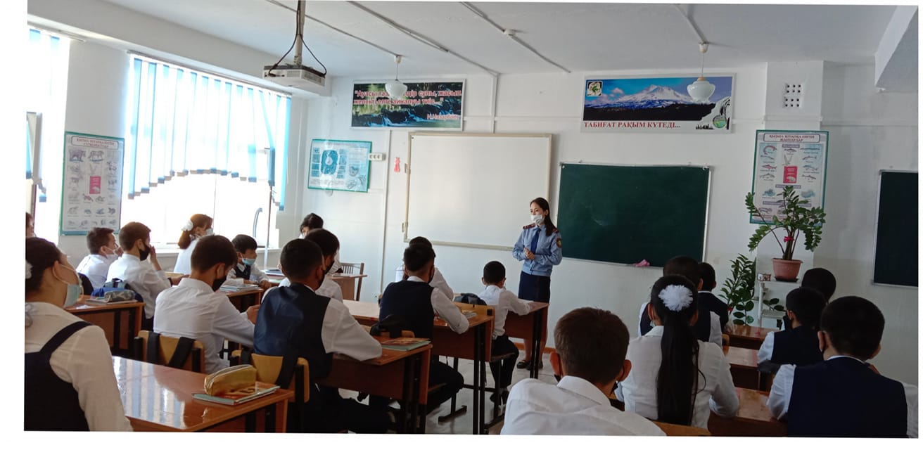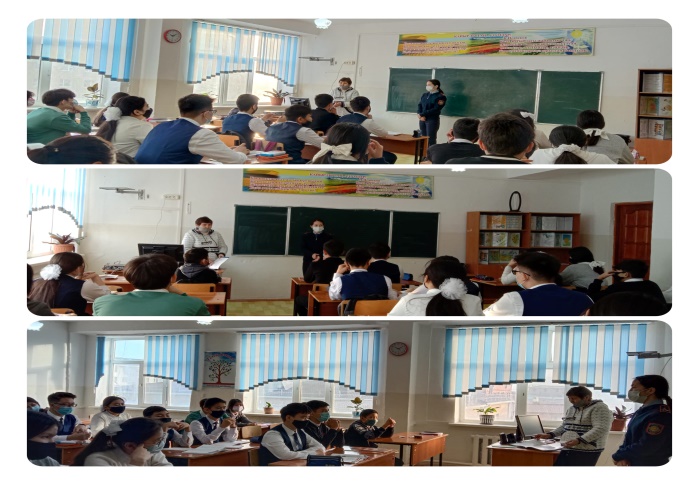 Ағымдағы жылдың 29 сәуір күні 2022 жылдың 25 сәуір - 20 мамыр аралығында Республика көлемінде “Абайлаңыз балалар” акциясы және 25-29 сәуір аралығында "Құқықтық тәртіп" жедел-профилактикалық іс-шара аясында директордың тәрбие ісі жөніндегі орынбасары Г.Мукашева және полиция аға лейтенанты Г.Куркембаева мектебіміздің оқушыларына түсіндірме жұмыстарын жүргізді.