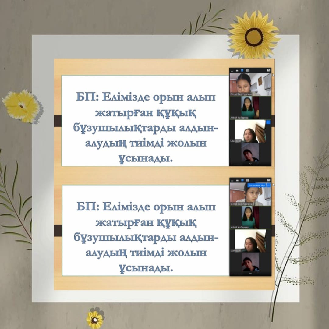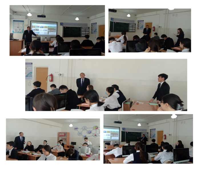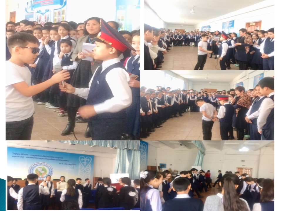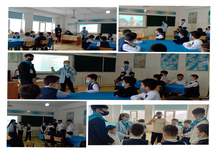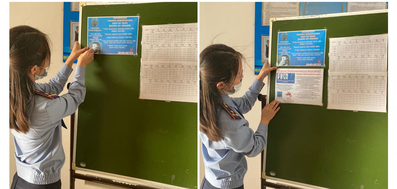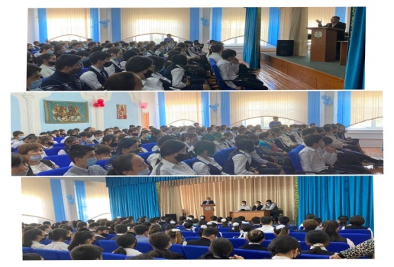 Ағымдағы жылдың 29 сәуір күні 2022 жылдың 25 сәуір - 20 мамыр аралығында Республика көлемінде “Абайлаңыз балалар” акциясы және 25-29 сәуір аралығында "Құқықтық тәртіп" жедел-профилактикалық іс-шара аясында директордың тәрбие ісі жөніндегі орынбасары Г.Мукашева және полиция аға лейтенанты Г.Куркембаева мектебіміздің оқушыларына түсіндірме жұмыстарын жүргізді.