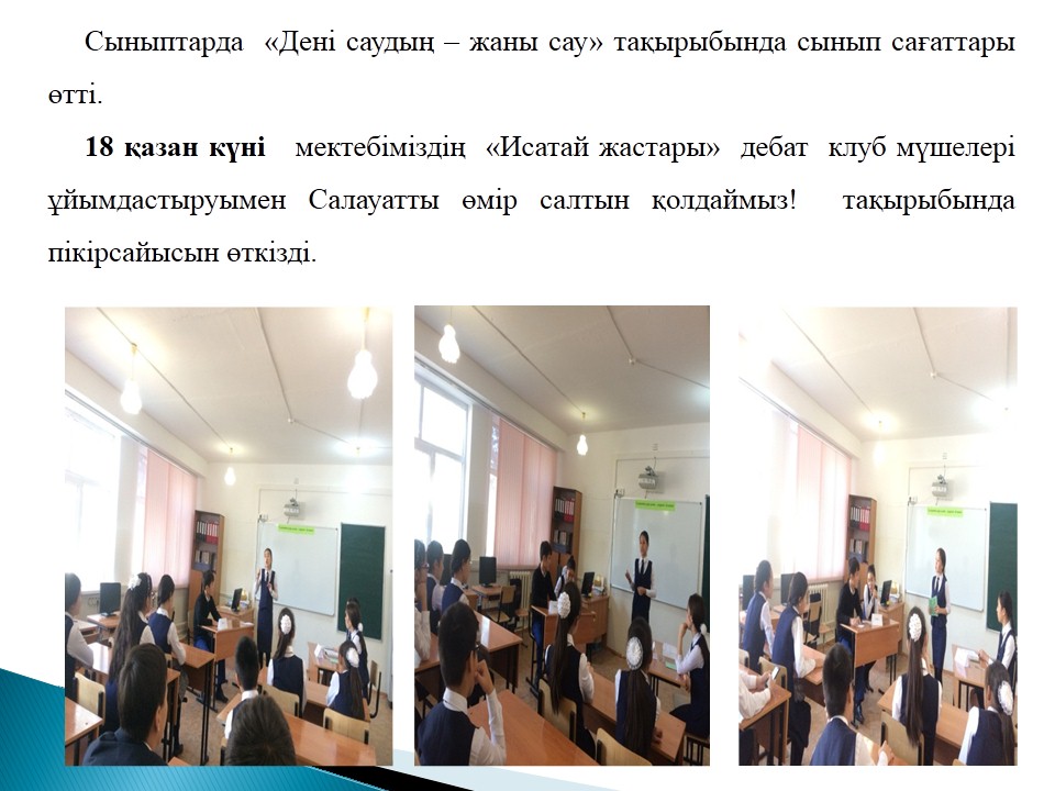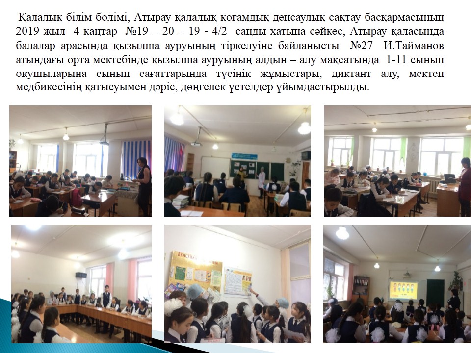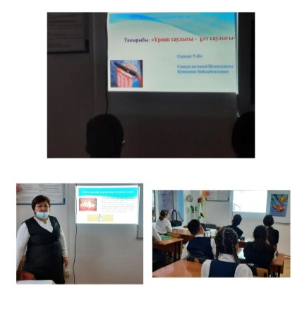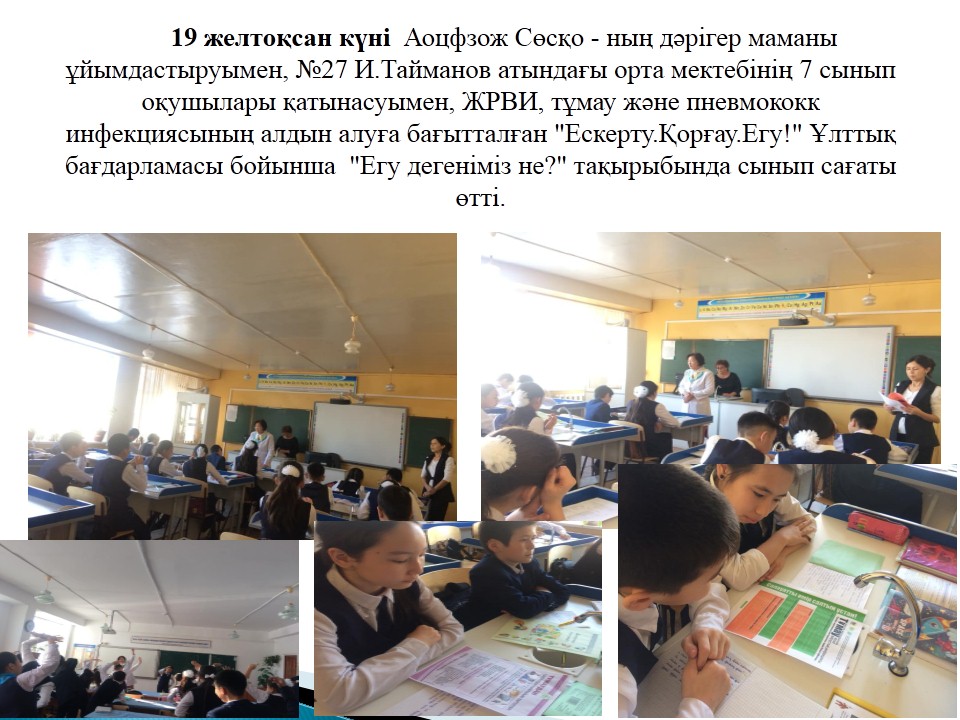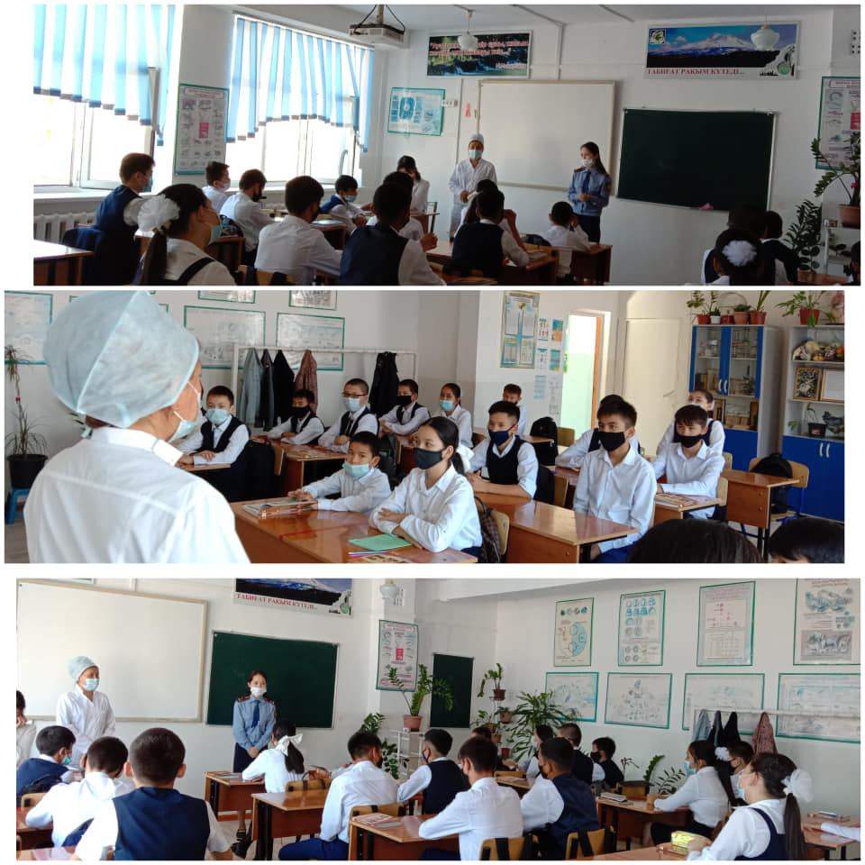Мақсаты: Коронавирустық инфекция мен ЖРВИ жөнінде ақпарат беру, салауатты өмір салтын насихаттау. Шара аясында оқушыларға коронавирустық инфекция мен ЖРВИ-дың алдын алу жолдары, сақтық шаралары және олардың белгілері, сақтану жолдары туралы ақпарат жұмыстары жүргізілді. Сондай-ақ оқушылардың қойған сұрақтарына орталық дәрігер маманы Тайбуриева Гульвира Адылгалиевна толықтай жауап берді. Шара соңында оқушыларға ақпараттық - оқыту материалдары таратылды.