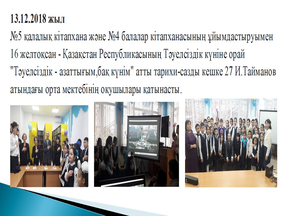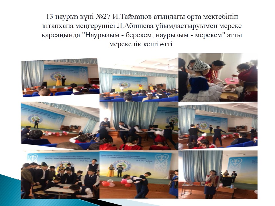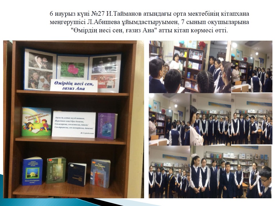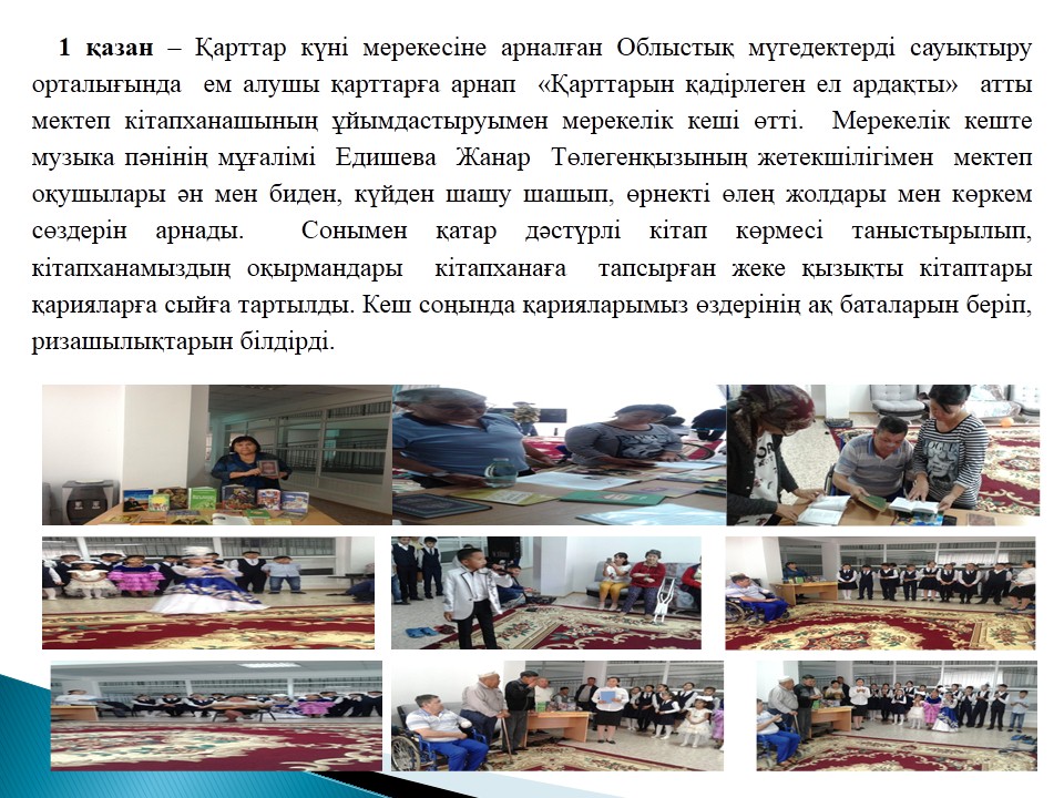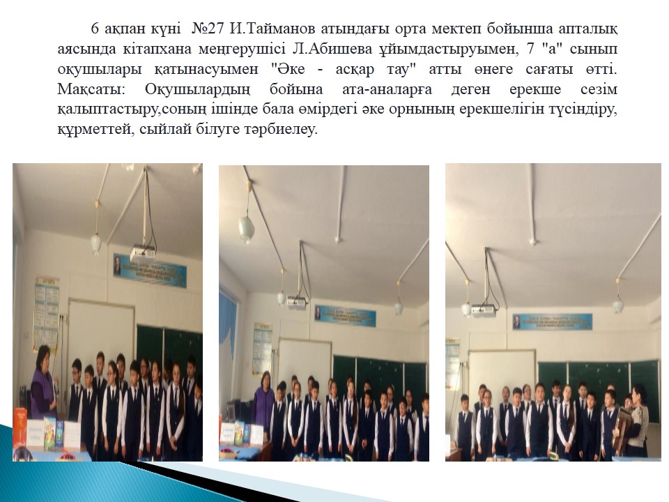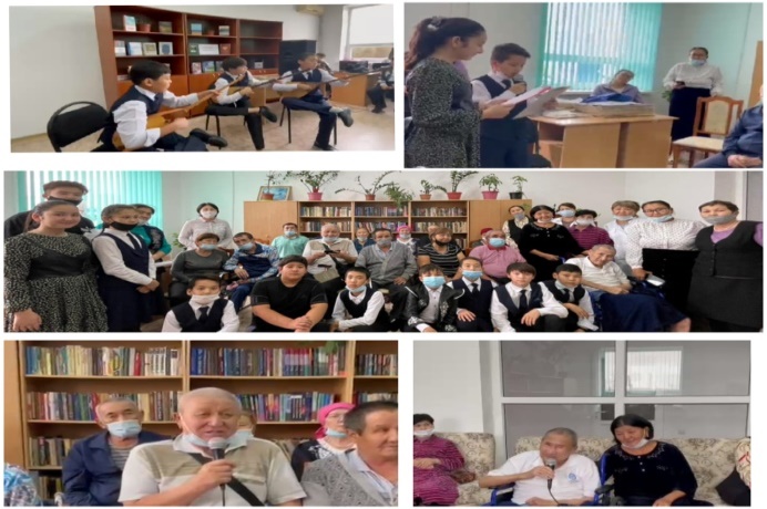 Көпті көрген дана-гөй қарттарымыздың өнегелі өмірін үлгі ете отырып, ғибрат боларлық сөздерін бойларына сіңіріп, үлкенге құрмет, кішіге ізет ете білетін инабатты, ақылды, ата - баба аманатына адал, ұлттық тәлім - тәрбиені бойына сіңірген, еңбекқор, кішіпейіл, мейірімді, төзімді, өнерлі тұлға тәрбиелеу мақсатында Атырау қаласы №27 И.Тайманов атындағы орта мектеп кітапханасы мен №5 Атырау қалалық кітапханасымен бірлескен іс шара жоспарына сәйкес "Қарттарым - асыл қазынам" атты шарасы өтті. Шарада мектебіміздің белсенді өнерлі оқушылары мерекелік ән-шашуын арнады. Ардагерлер өздерінің жүрек жарды тілектерін айтып, баталарын берді.