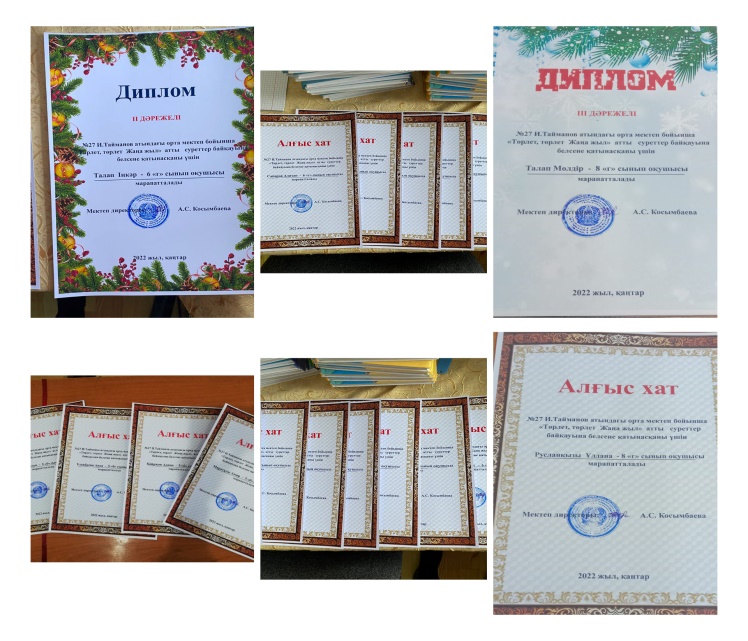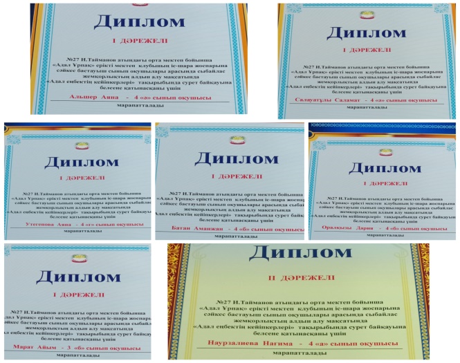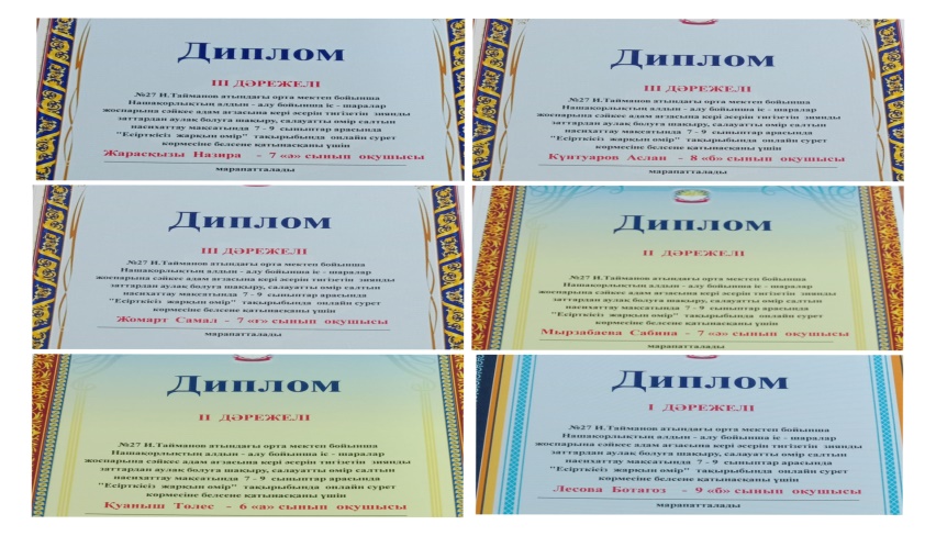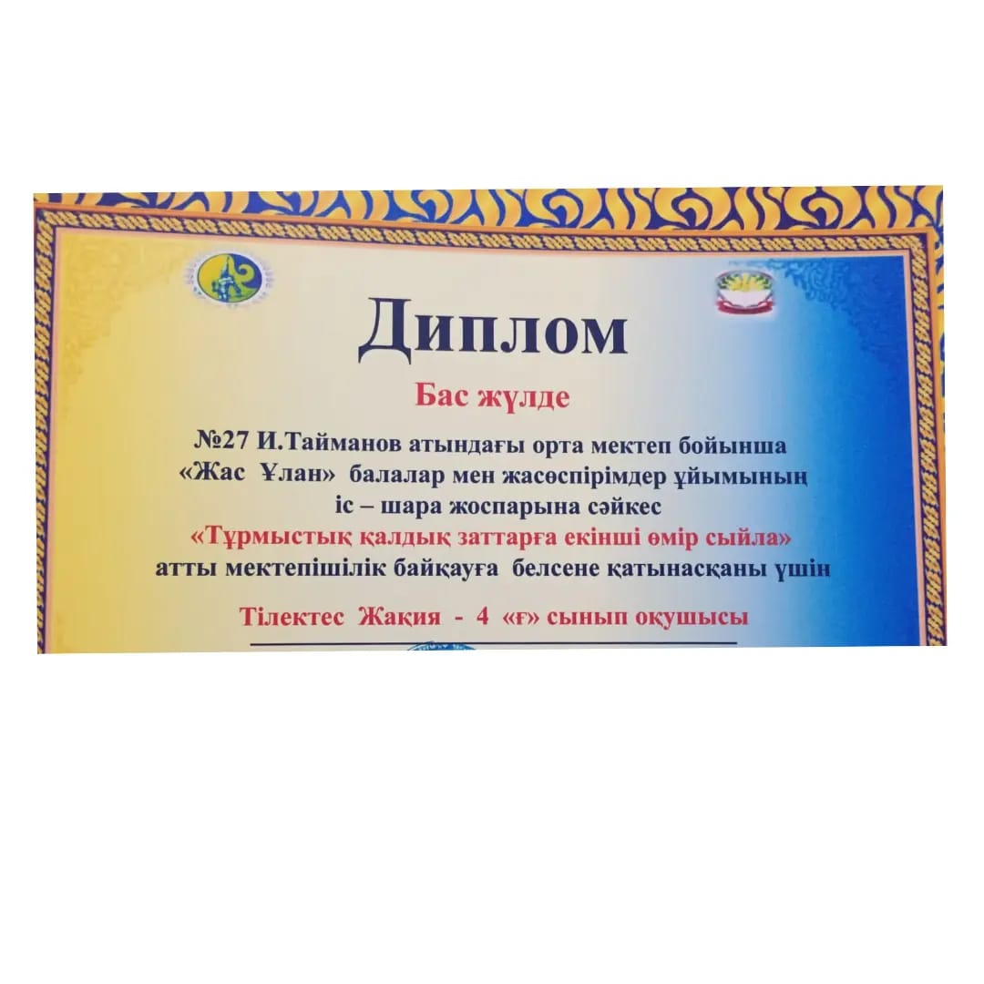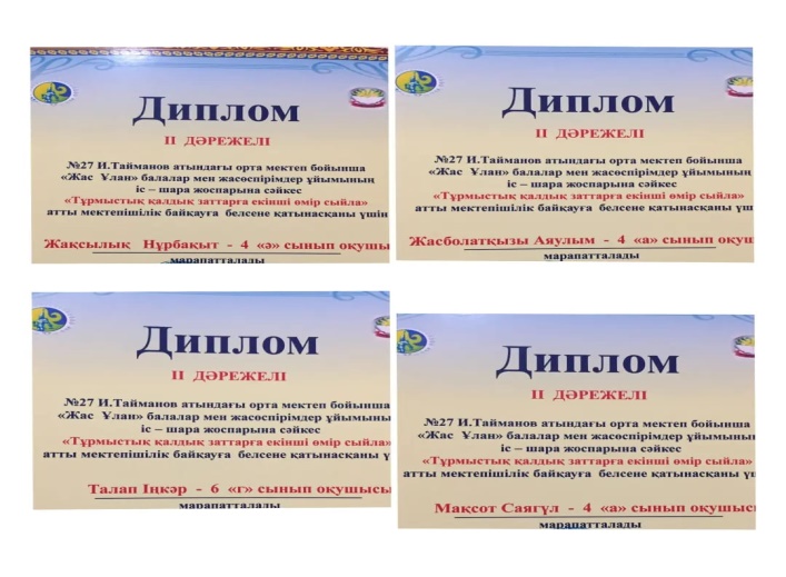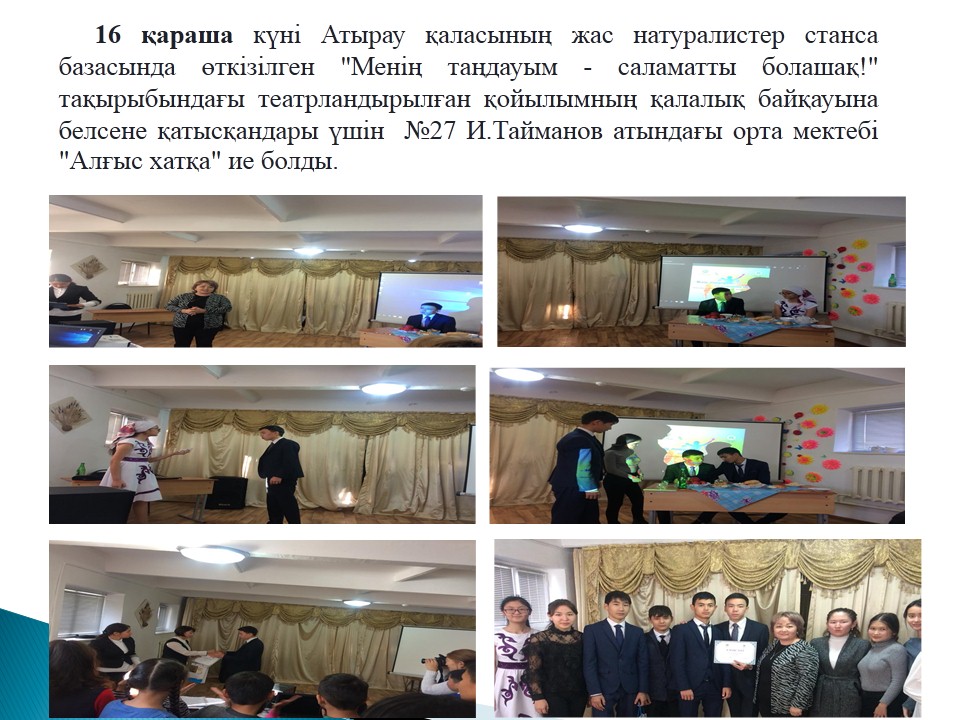 2021 жылдың 13 қараша күні Атырау қаласы білім бөлімінің ұйымдастыруымен оқушылар арасында нашақорлық пен есірткіге тәуелділіктің алдын алуға бағытталған "Менің таңдауым - саламатты болашақ!" үздік театрландырылған қойылымдар конкурсына қатынасқаны үшін Атырау қаласы №27 Исатай Тайманов атындағы орта мектебінің белсенді оқушылары Алғыс хатпен марапатталды.