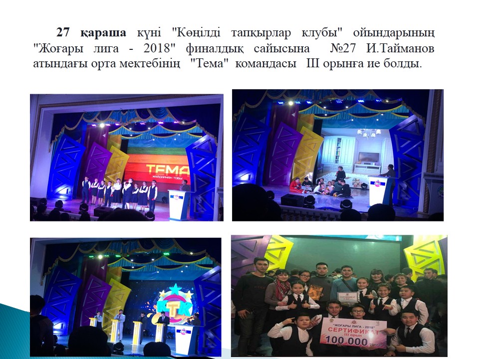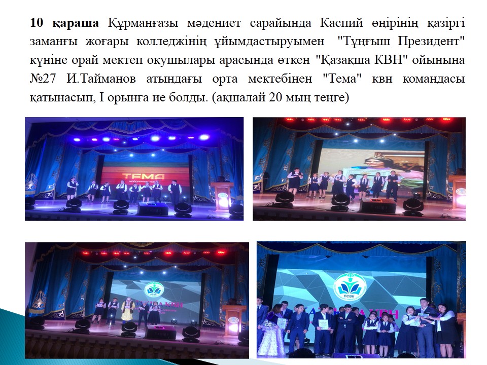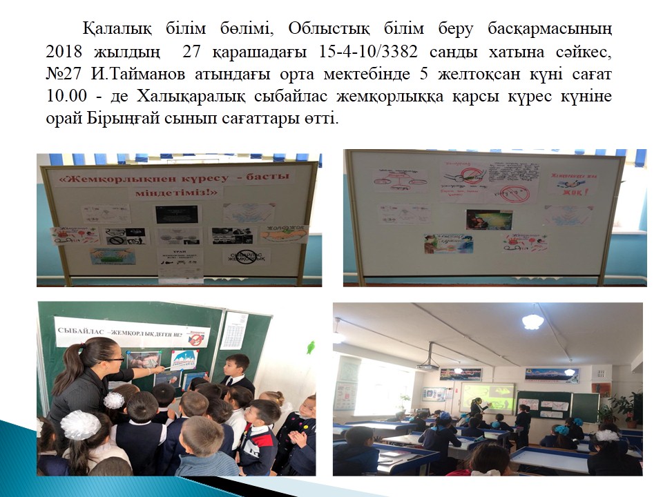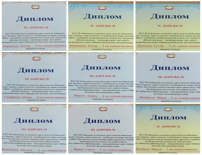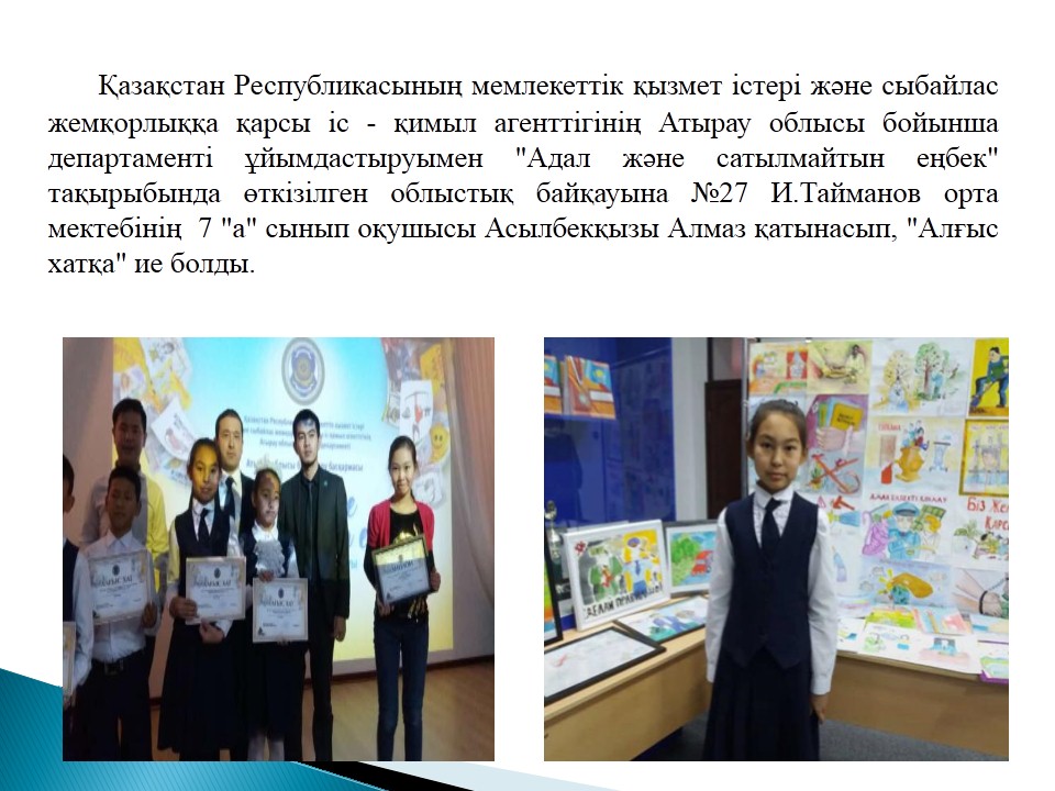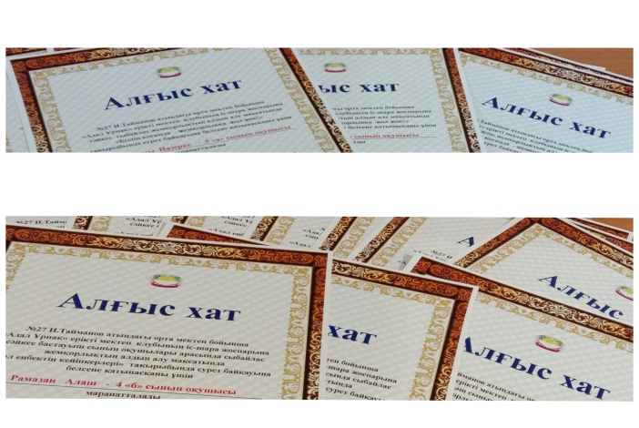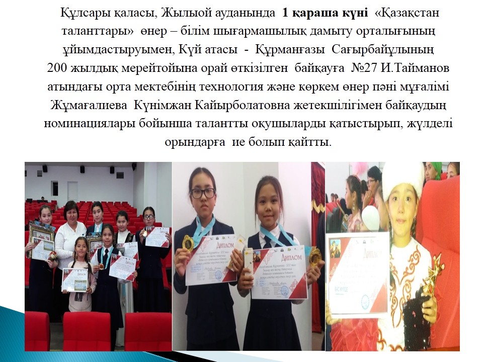 2021 жылдың 13 қараша күні Атырау қаласы білім бөлімінің ұйымдастыруымен оқушылар арасында нашақорлық пен есірткіге тәуелділіктің алдын алуға бағытталған "Менің таңдауым - саламатты болашақ!" үздік театрландырылған қойылымдар конкурсына қатынасқаны үшін Атырау қаласы №27 Исатай Тайманов атындағы орта мектебінің белсенді оқушылары Алғыс хатпен марапатталды.