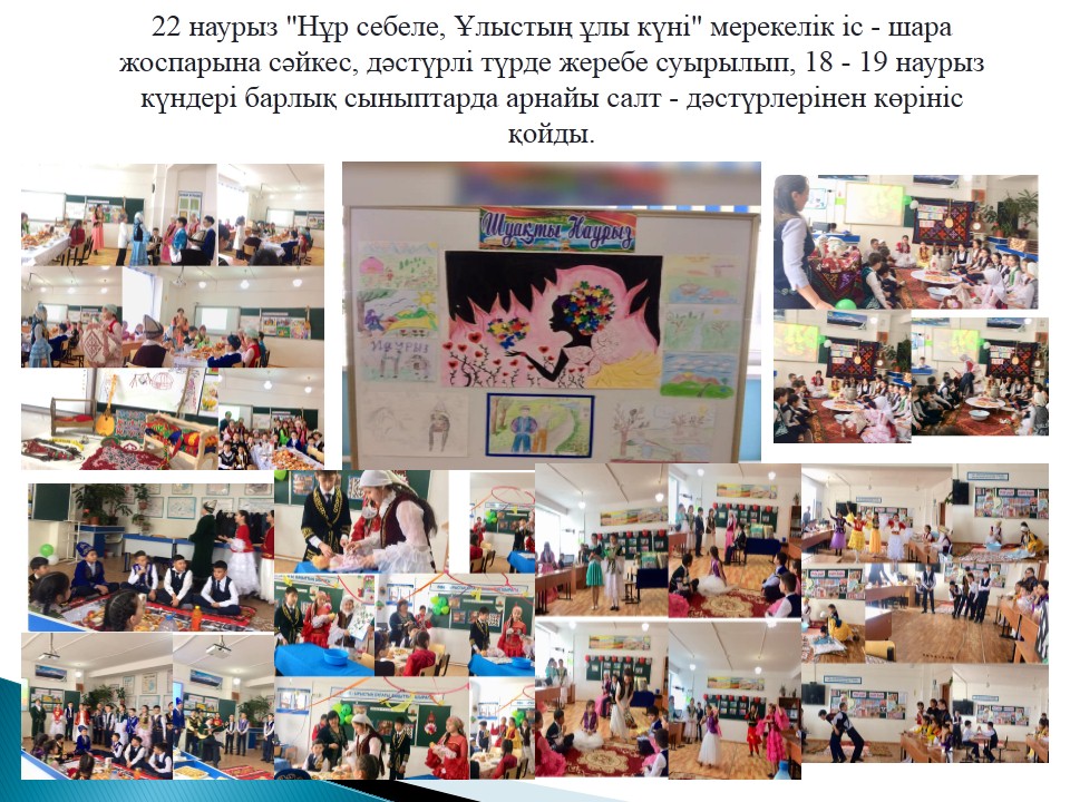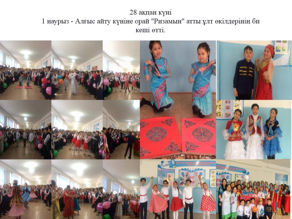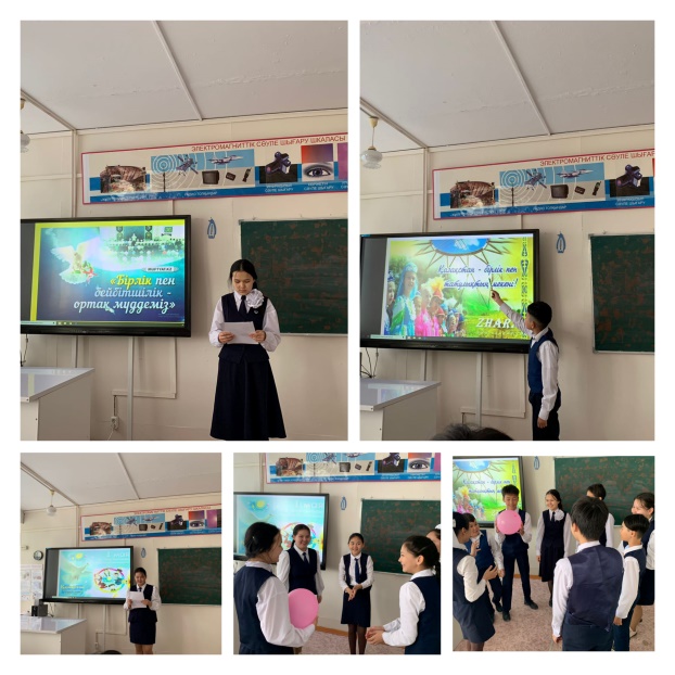 1 мамыр - Қазақстан халқының бірлігі күні мерекесіне орай Қазақстандағы бейбітшілік пен келісімді нығайту, азаматтарды ел дамуының ортақ міндеті айналасына топтастыру, ортақ мәдени - рухани құндылықтар мен жалпыұлттық сананы қалыптастыру мақсатында барлық сыныптарда "Бірлік сабағы" өтті.