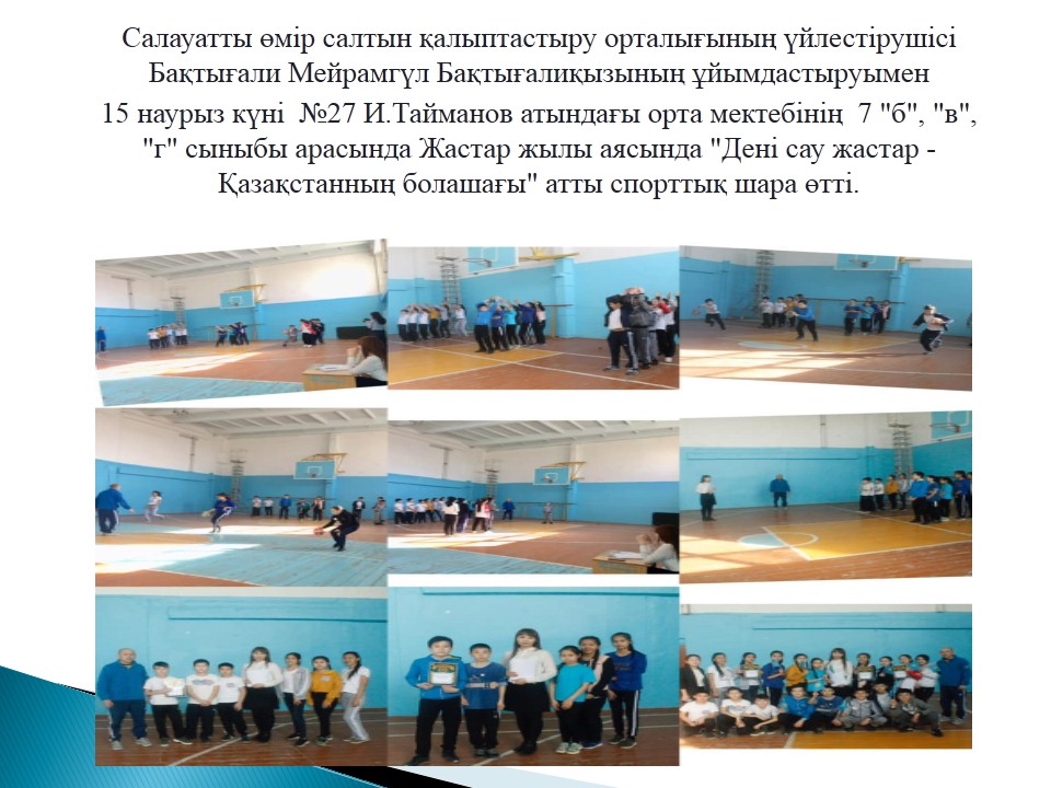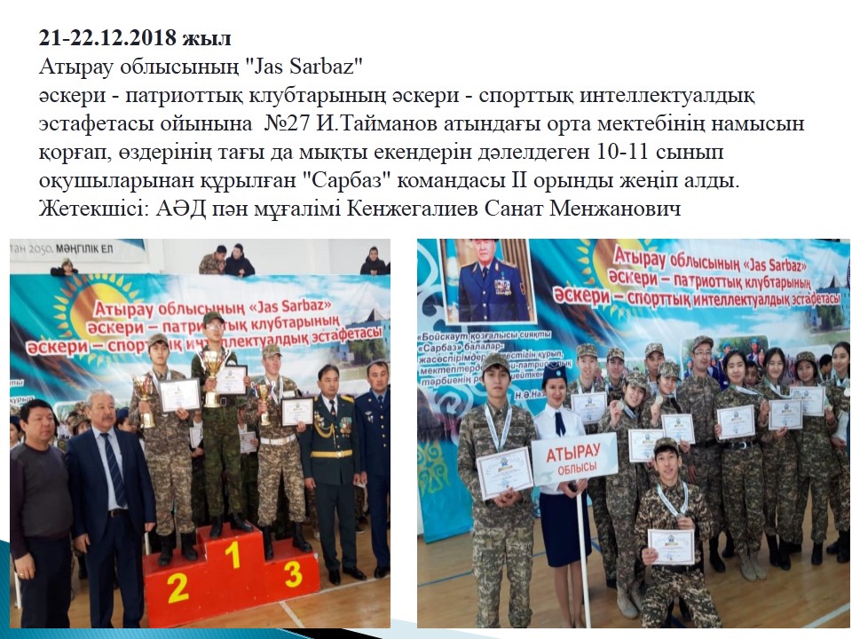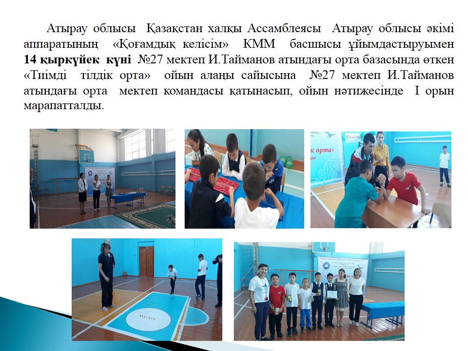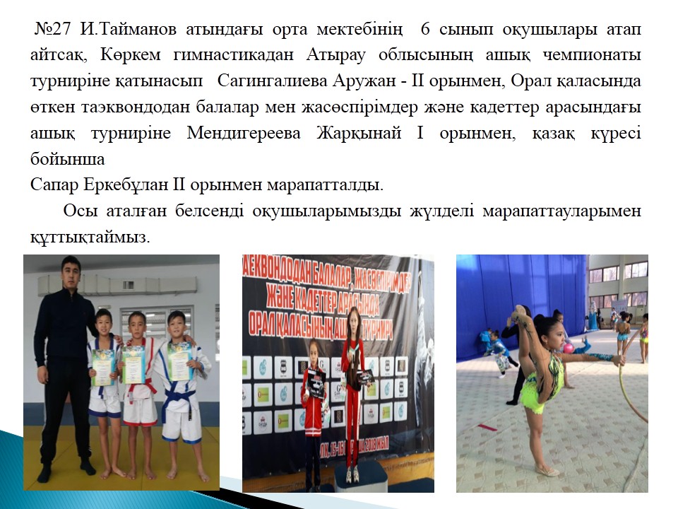 Атырау қалалық ішкі саясат бөлімінің қолдауымен, Атырау облыстық салауатты өмір салтын қалыптастыру орталығының бірлесуімен, "Нұр белес" қоғамдық бірлестігінің ұйымдастыруымен "Спорттық еріктілік" бағыты бойынша оқытудан өткен Атырау қаласының №22, №27, №28 орта мектептердің жас еріктілері арасында "Спорт - денсаулық негізі" тақырыбында өткізілген спорттық шараға белсене қатынасқаны үшін Атырау қаласы №27 И.Тайманов атындағы орта мектебінің командасы II орынға ие болды.