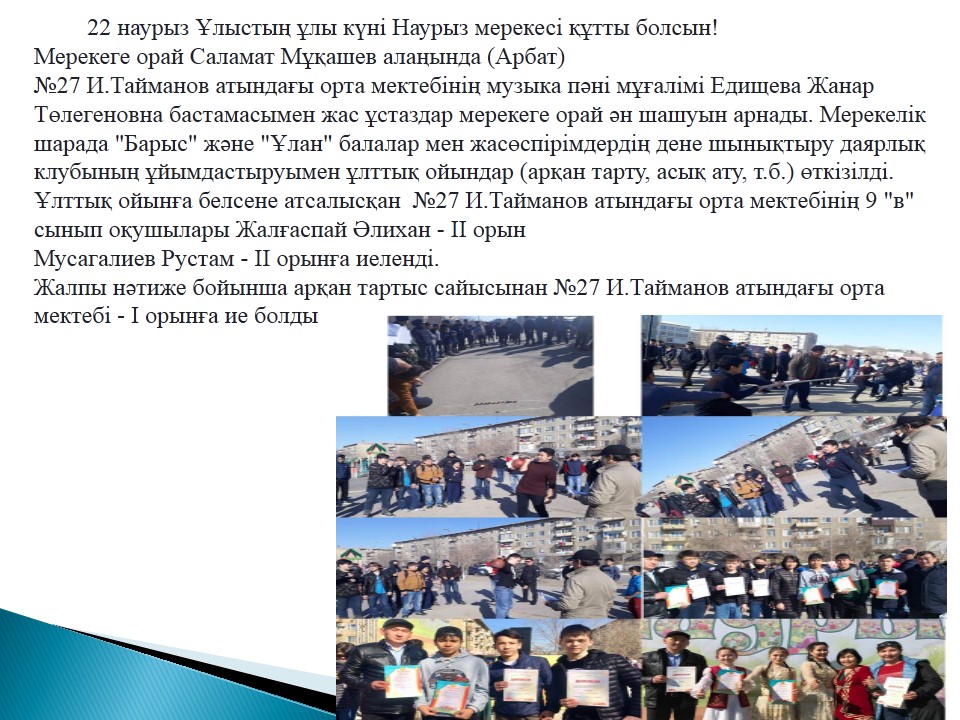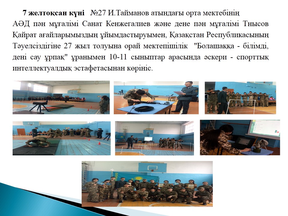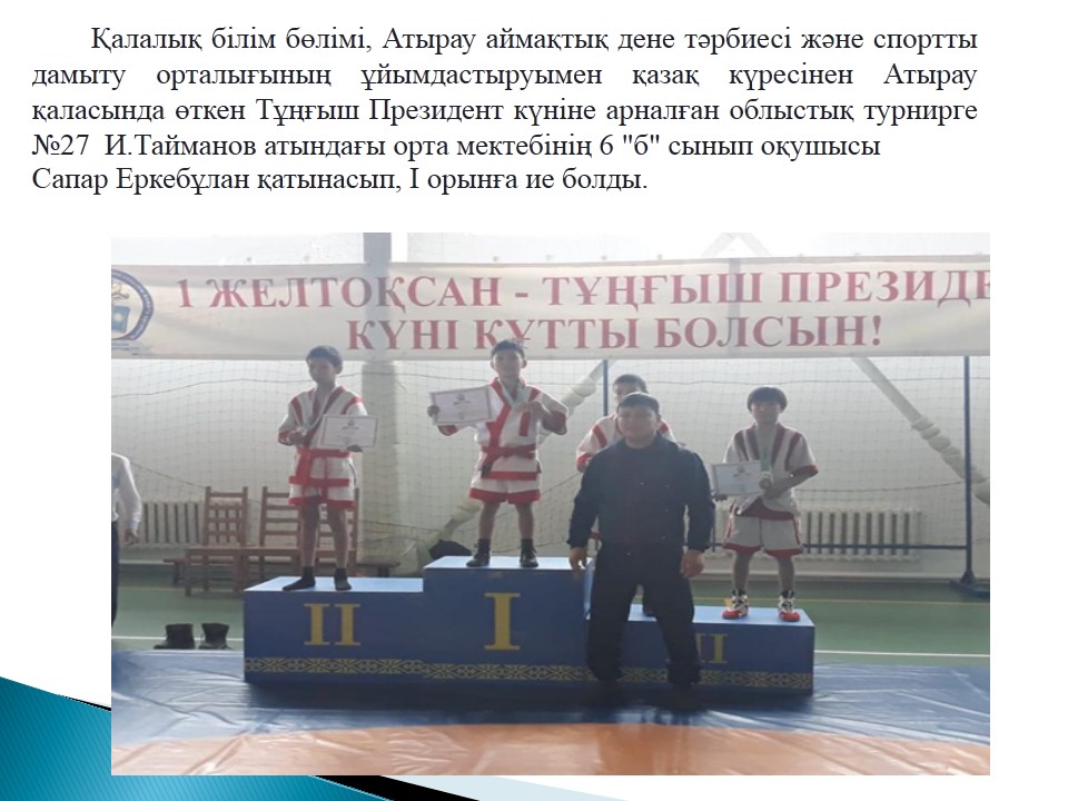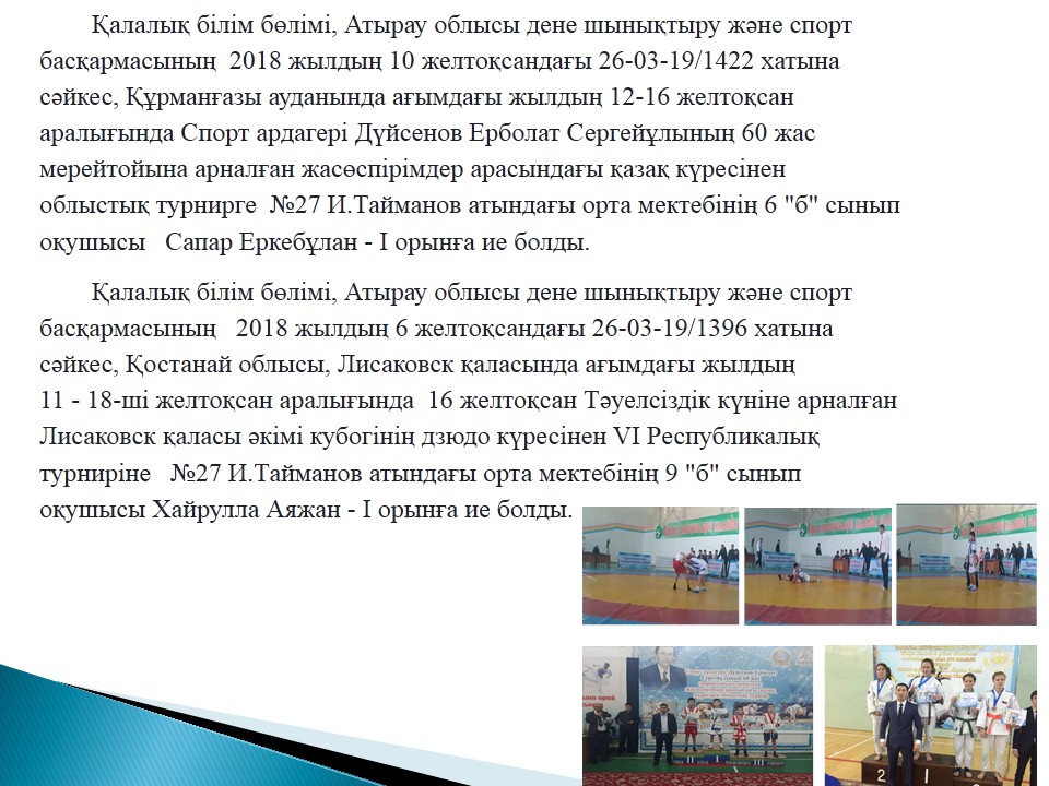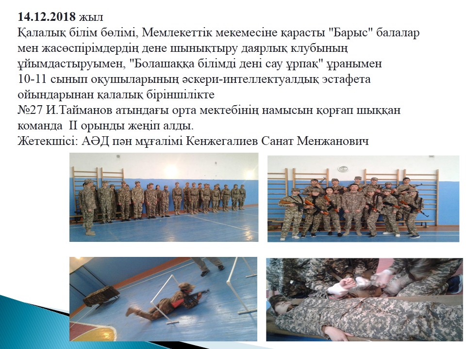 Атырау қалалық ішкі саясат бөлімінің қолдауымен, Атырау облыстық салауатты өмір салтын қалыптастыру орталығының бірлесуімен, "Нұр белес" қоғамдық бірлестігінің ұйымдастыруымен "Спорттық еріктілік" бағыты бойынша оқытудан өткен Атырау қаласының №22, №27, №28 орта мектептердің жас еріктілері арасында "Спорт - денсаулық негізі" тақырыбында өткізілген спорттық шараға белсене қатынасқаны үшін Атырау қаласы №27 И.Тайманов атындағы орта мектебінің командасы II орынға ие болды.