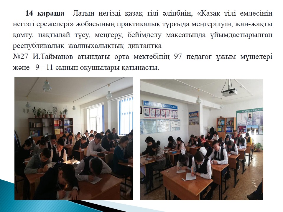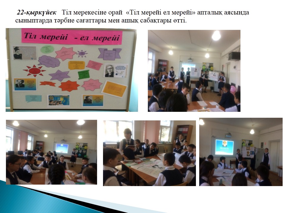 Атырау қаласы №27 И.Тайманов атындағы орта мектебінде "Тіл мәртебесі - ел мәртебесі" тілдер апталығы аясында мемлекеттік тілдің маңызы мен мәртебесін кеңінен насихаттау, өзге ұлт өкілдері арасында қазақ тілін білу деңгейін көтеру және оқып үйренуге деген ықыласы мен қызығушылығын арттыру мақсатында сыныптарда сынып сағаттары өтті.
