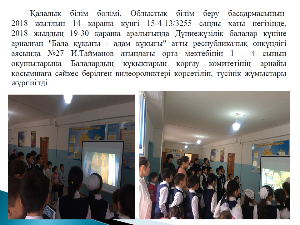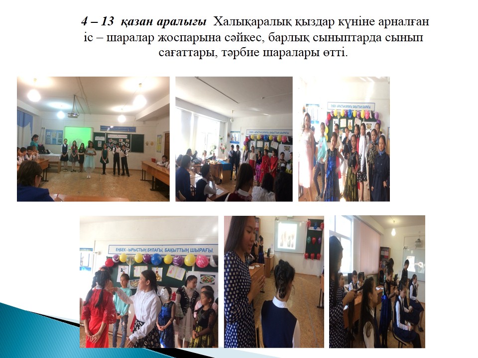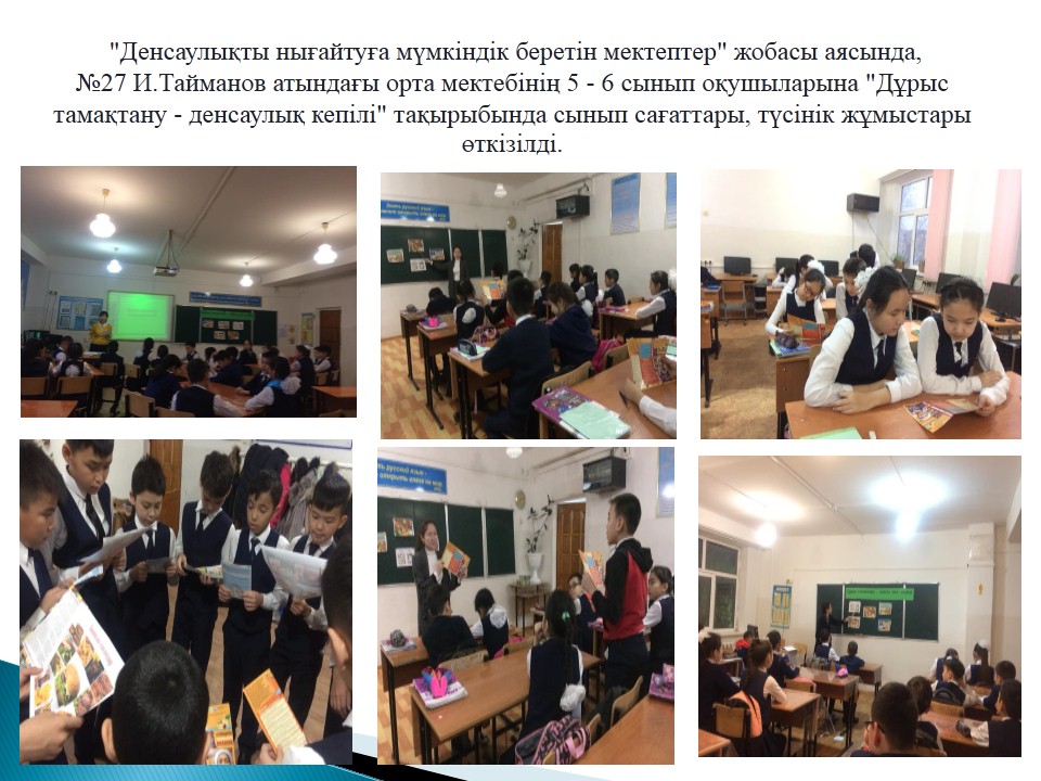 Атырау қаласы №27 И.Тайманов атындағы орта мектепте ағымдағы жылдың 4-8 қазан аралығында Халықаралық қыздар күніне арналған Республикалық апталық аясында сыныптарда сынып сағаттары, спорттық шара, тренинг, "Қыз бала гигиенасы және денсаулығы" тақырыбында мектеп медбикесімен ақпараттық-санитарлық жұмыстары, мектептің "Сымбат" қыздар ұйымының жетекшісі К. Жумагалиева және директордың тәрбие ісі жөніндегі орынбасары Г. Мукашева қатынасуымен қыз балалармен жиналыс өтті. https://m.facebook.com/story.php?story_fbid=1181350085689759&id=100014443350259