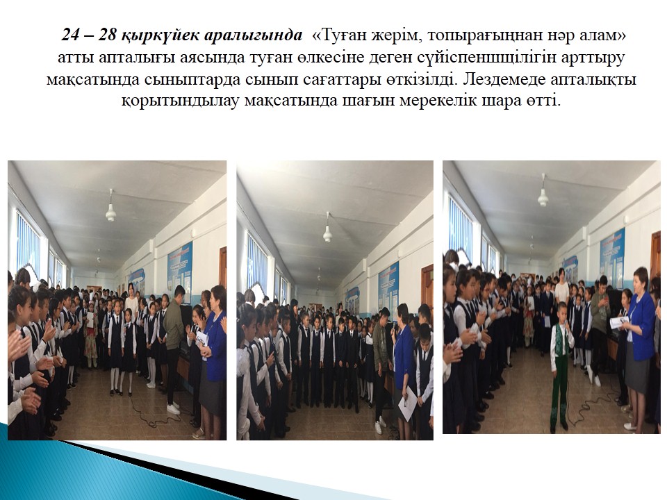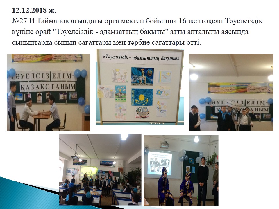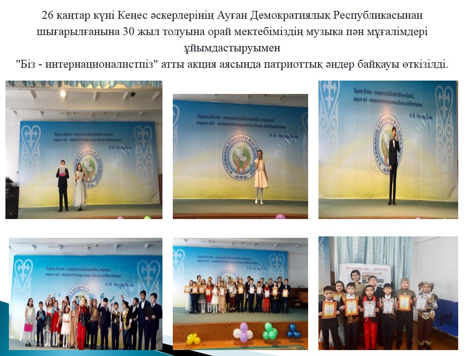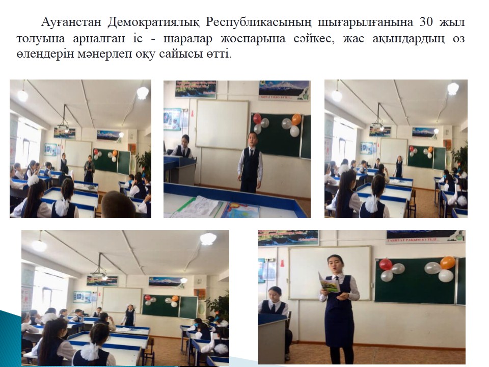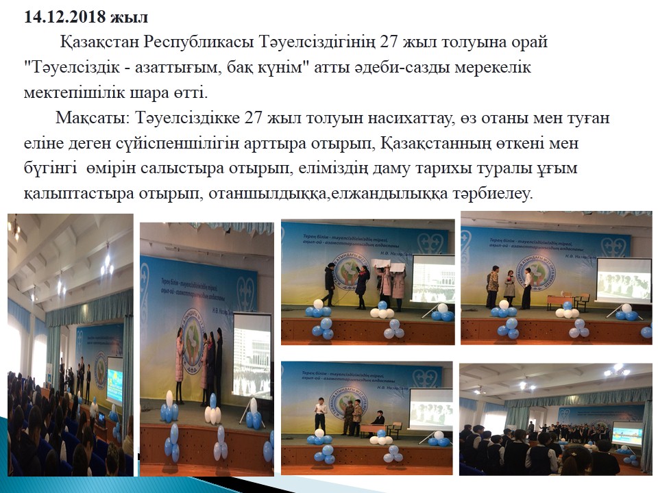 Қазақстан Республикасы Тәуелсіздігінің 30 жылдығына орай, 2-11 сынып оқушыларына «Тәуелсіздік жетістіктері» тақырыбында сынып сағаттары өткізілді.