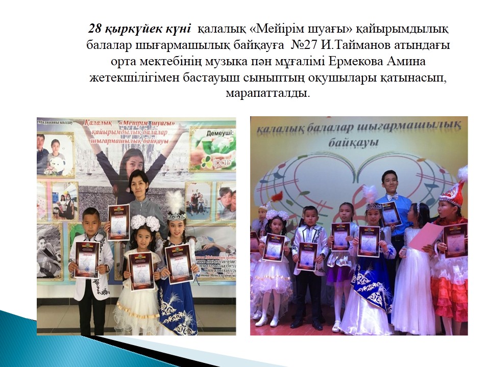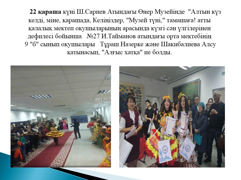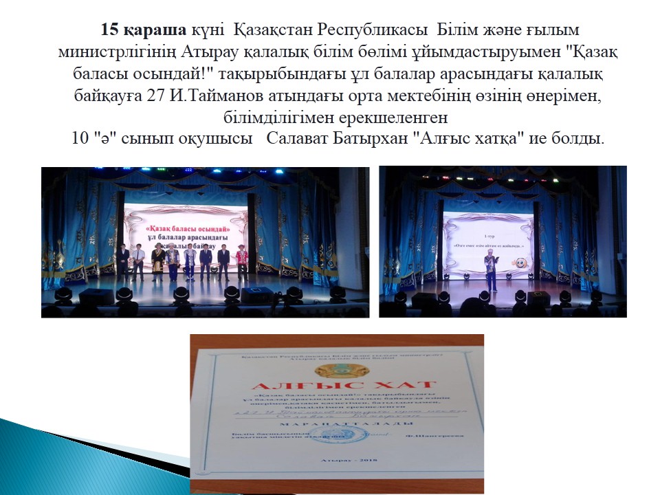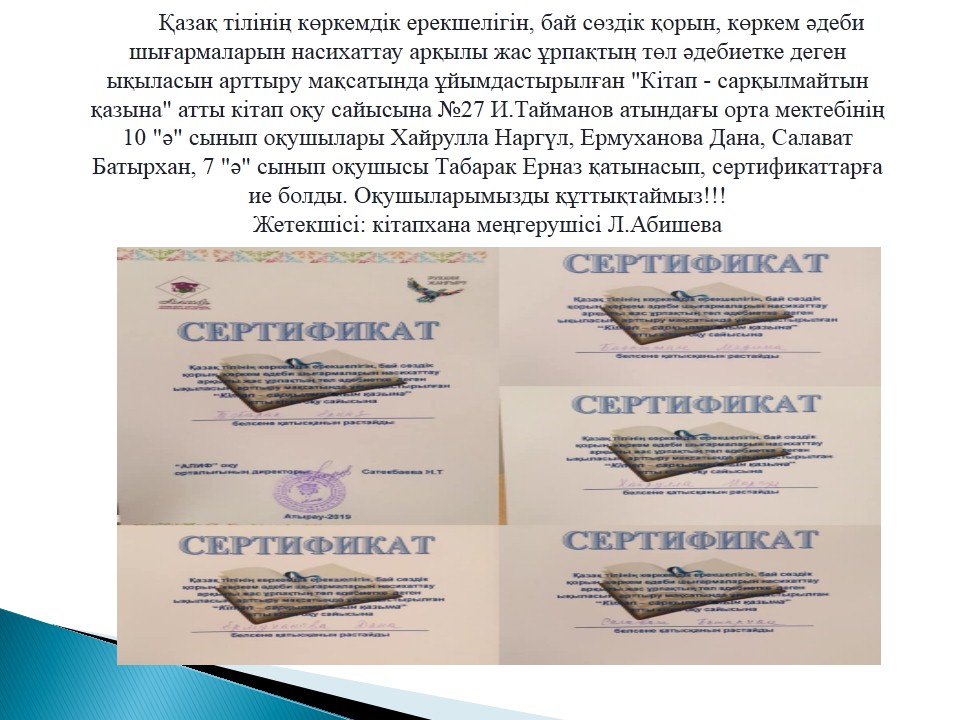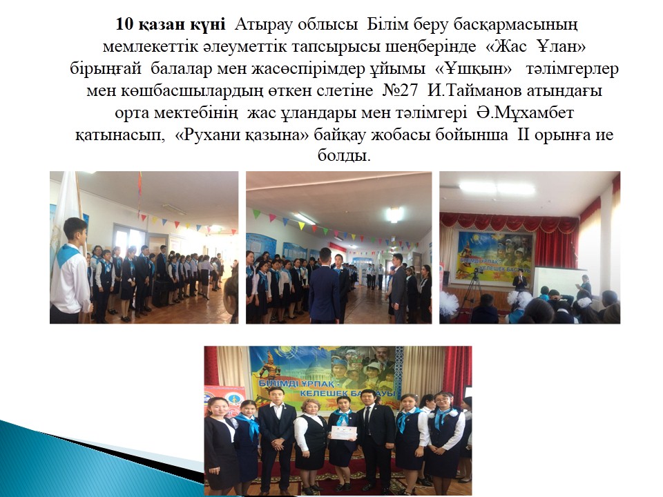 "Жас Ұлан" бірыңғай балалар мен жасөспірімдер ұйымына 10 жыл: айқын мақсат, межелі бағыт, көшбасшы тұлғасын қалыптастыру тақырыбындағы ұйым көшбасшылары мен жетекші-тәлімгерлерге арналған ағымдағы жылдың 13 қазан күні болған слетке қатысқаны үшін Атырау қаласы №27 И.Тайманов атындағы орта мектебінің тәлімгері Мұхамбет Әсемгүл Мақсотқалиқызы алғыс хатпен және мектептің "Жас Ұлан" ББЖ ұйымының белсенді мүшелері "Жас Ұлан " ББЖҰ ҚБ-нің төрайымы Мартагүл Төлеуқызынан Алғыс хат және сертификаттармен марапатталды.