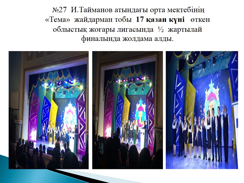 Ағымдағы жылдың 6 қараша күні Атырау облысы мектеп оқушылары арасындағы "Жас Ұлан" бірыңғай балалар мен жасөспірімдер ұйымының 10 жылдығына арналған "ZhAS ULAN CUP" облыстық пікірсайыс турниріне қатынасқан Атырау қаласы №27 И.Тайманов атындағы орта мектебінің "Исатай жастары" командасы алғыс хатпен марапатталды.