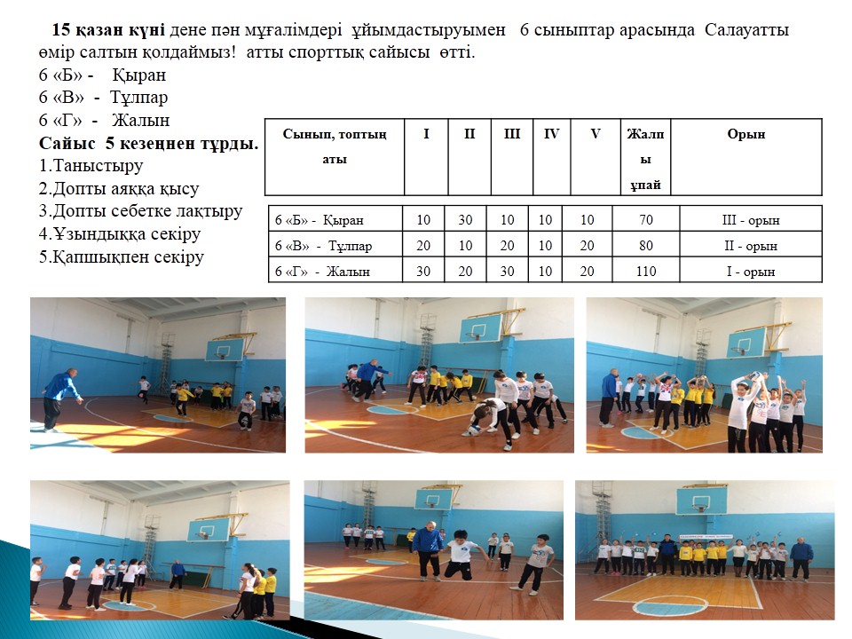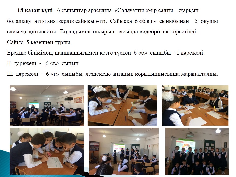 Ағымдағы жылдың 1 - 5 қараша күндері күзгі каникул кезінде балалардың демалысын, бос уақытын тиімді ұйымдастыру мақсатында іс - шаралар жоспарына сәйкес 5 - 6 сыныптар арасында "Күз аруы - 2021" онлайн байқауы, 6 "г" сынып оқушыларының қатысуымен спорттық жарыстар, 8 сыныптар арасында волейбол ойыны өткізілді.