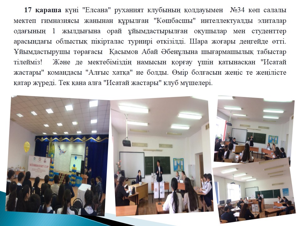 8 сыныптар арасында "Білімді ұрпақ - ел болашағы" атты интеллектуалды сайыс ұйымдастырылды. https://m.facebook.com/story.php?story_fbid=1202879910203443&id=100014443350259