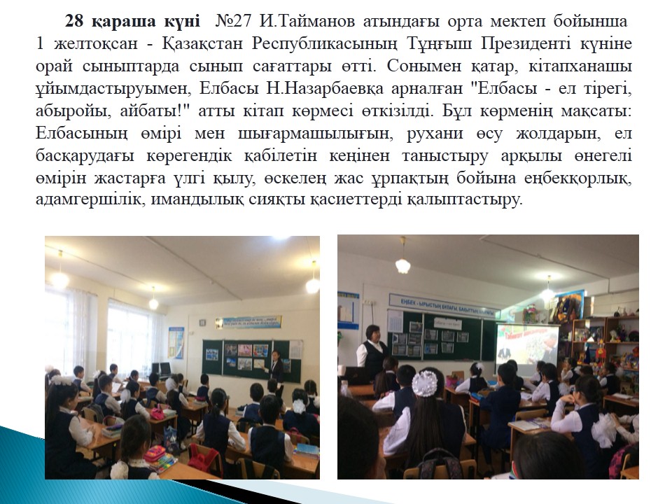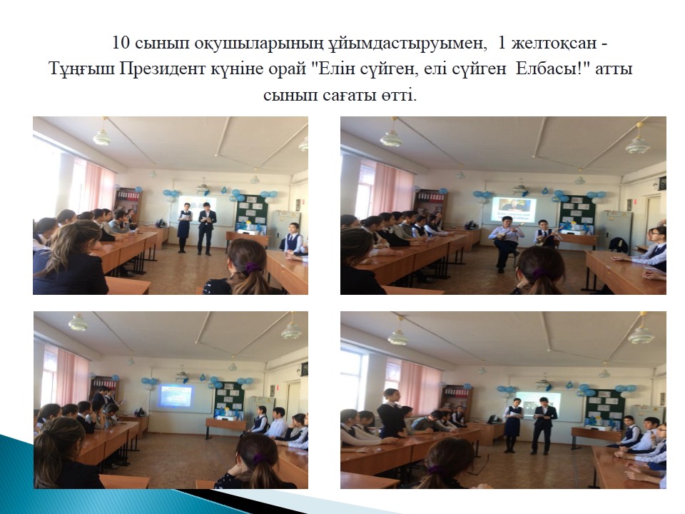 Ағымдағы жылдың 30 қараша күні 1 желтоқсан - Тұңғыш Президент күніне арналған сынып сағаттары, мерекелік шара лездеме өтті.