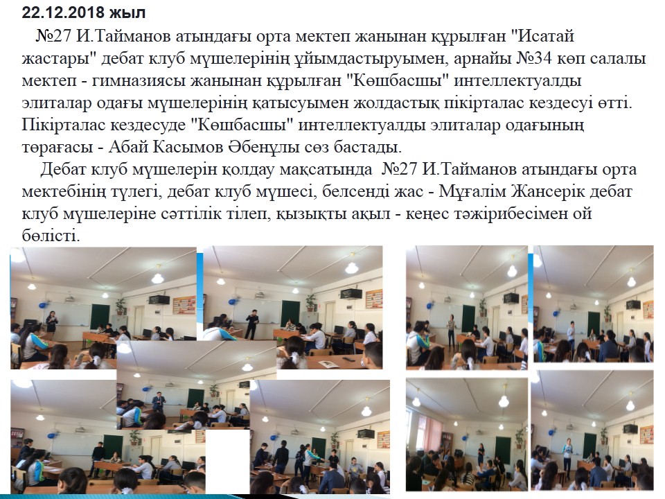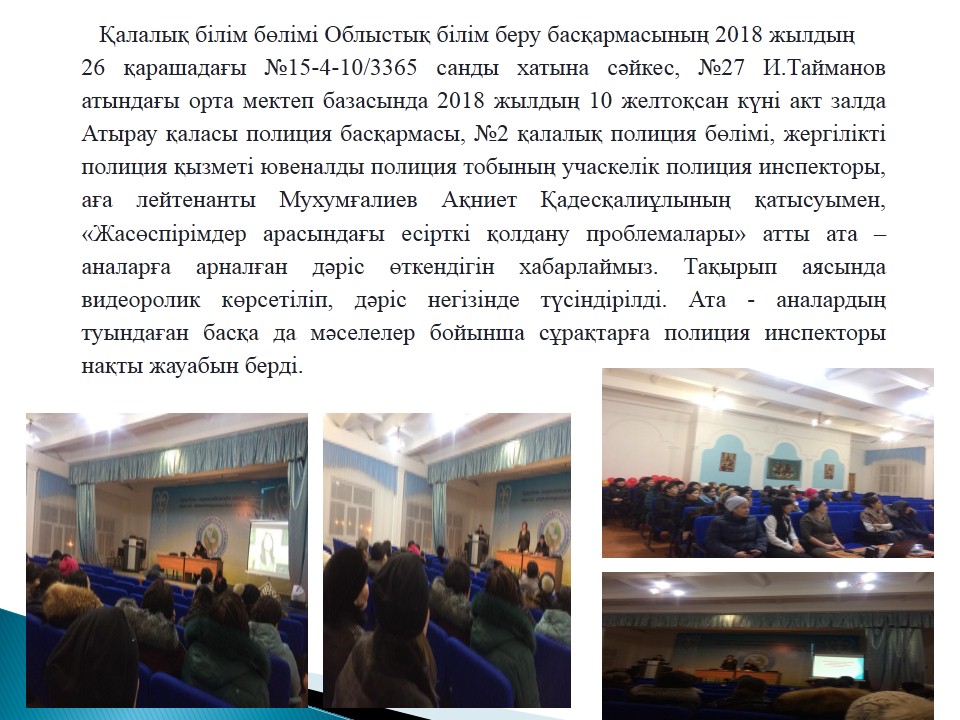 Ағымдағы жылдың 15 қыркүйек күні Атырау қаласы №27 И.Тайманов атындағы орта мектебінде 13-19 қыркүйек аралығында Республика аумағында өткізіліп жатырған «Жасөспірім» жедел-профилактикалық іс-шарасы аясында Атырау №2 ҚПБ ЖПҚБ ЮПТ УПИ-і полиция аға лейтенанты Гузель Куркембаева мектебіміздің 8 сынып оқушыларына «Құқықтық тәртіп» тақырыбында және ҚР әкімшілік құқық бұзушылық кодексінің 442 бабы «Кәмелетке толмағандардың заңды өкілдерінің еріп жүруінсіз түнгі уақытта ойын-сауық мекемелерінде немесе тұрғын жайдан тыс жерде болуы» және 435 бабы «Кәмелетке толмаған адам жасаған бұзақылық» бойынша түсіндірме жұмыстары жүргізілді. https://m.facebook.com/story.php?story_fbid=1165644250593676&id=100014443350259