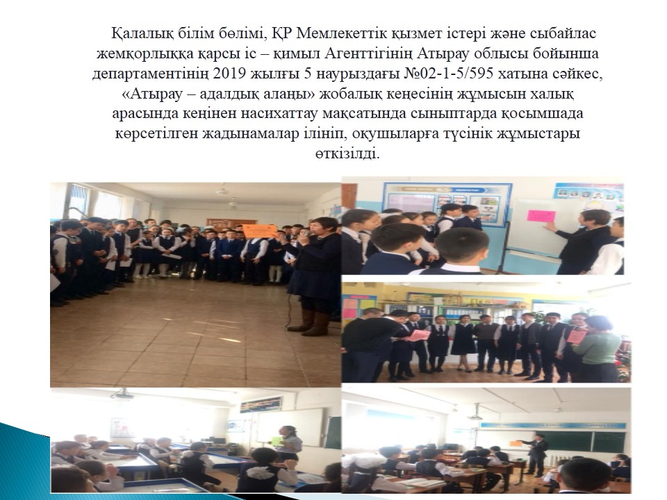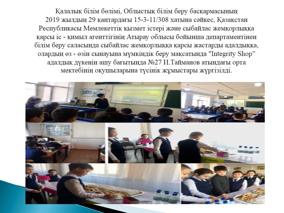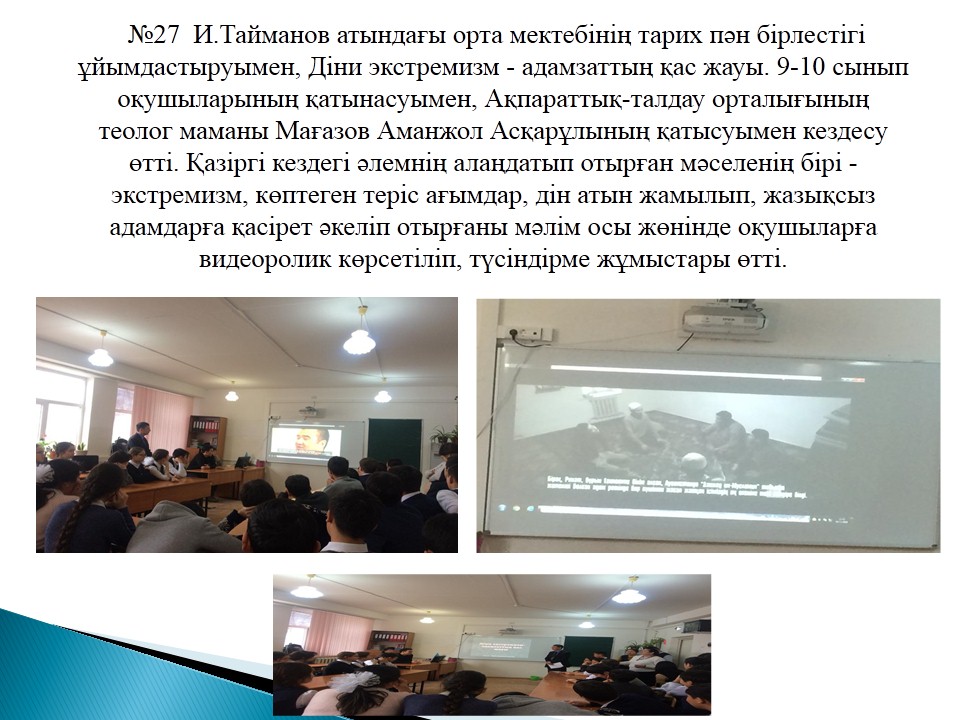 Ағымдағы жылдың 13 қазан күні Атырау қаласы №27 И.Тайманов атындағы орта мектебінің 9 - 11 сынып оқушыларының қатысуымен діни экстремизмнің алдын алу мақсатында Атырау облысы Дін істері басқармасы "Ақпараттық талдау орталығы" КММ-нің заңгері - Рахимов Әліби Талғатұлы және "Жардем-Атырау" корпоративтік қорының директоры - Жаулин Ербол Еділұлымен, "Шапағат" деструктивті діни ағымдардан зардап шеккендерге көмек орталығының теологы Сариев Сұлтангелді Серікұлы мамандарымен кездесу өтті. https://m.facebook.com/story.php?story_fbid=1189202874904480&id=100014443350259