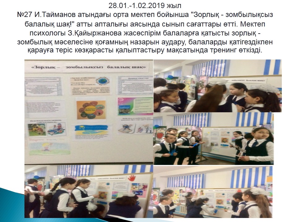 Ағымдағы жылдың 15 қыркүйек күні Атырау қаласы №27 И.Тайманов атындағы орта мектебінде 13 -19 қыркүйек аралығында Республика аумағында өткізіліп жатырған «Жасөспірім» жедел-профилактикалық іс-шарасы аясында Атырау №2 ҚПБ ЖПҚБ ЮПТ УПИ-і полиция аға лейтенанты Гузель Куркембаева және мектеп медбикесімен бірге мектебіміздің 8 сынып оқушыларына «Зорлық-зомбылық» тақырыбында және ҚР қылмыстық құқық бұзушылық кодексінің 122 бабы мен, отбасындағы зорлық-зомбылық және жыныстық қол сұғушылықтың алдын-алу туралы ережелері мен ескертпелер тақырыбында түсінік жұмыстары жүргізілді.