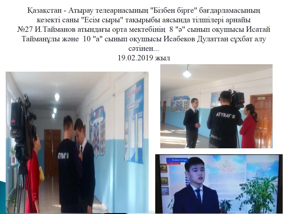 Атырау қаласы №27 И.Тайманов атындағы орта мектеп бойынша Қазақстан Республикасы халқының тілдер мерекесіне арналған "Қазақстан - үш тұғырлы тілді мемлекет: Мемлекеттік тілі-қазақ тілі" тілдер апталығы аясында шаралар ұйымдастырылды. https://m.facebook.com/story.php?story_fbid=1175481256276642&id=100014443350259