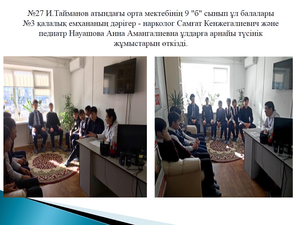 Ағымдағы жылдың 20 қазан күні Атырау қаласы №27 И.Тайманов атындағы орта мектебінің 9 -11 сынып оқушыларының қатысуымен Кәмелетке толмағандардың жыныстық тиіспеушілігіне қатысты жасалатын қылмыстардың алдын алу бағыты бойынша ҚПБ №2 ҚПБ ЖПҚ ЮПТ УПИ-ы полиция майоры А.Бақтыгереева, аға лейтенант Д.Доскалиева және дәрігер гинеколог маманмен жиналыс өтті.