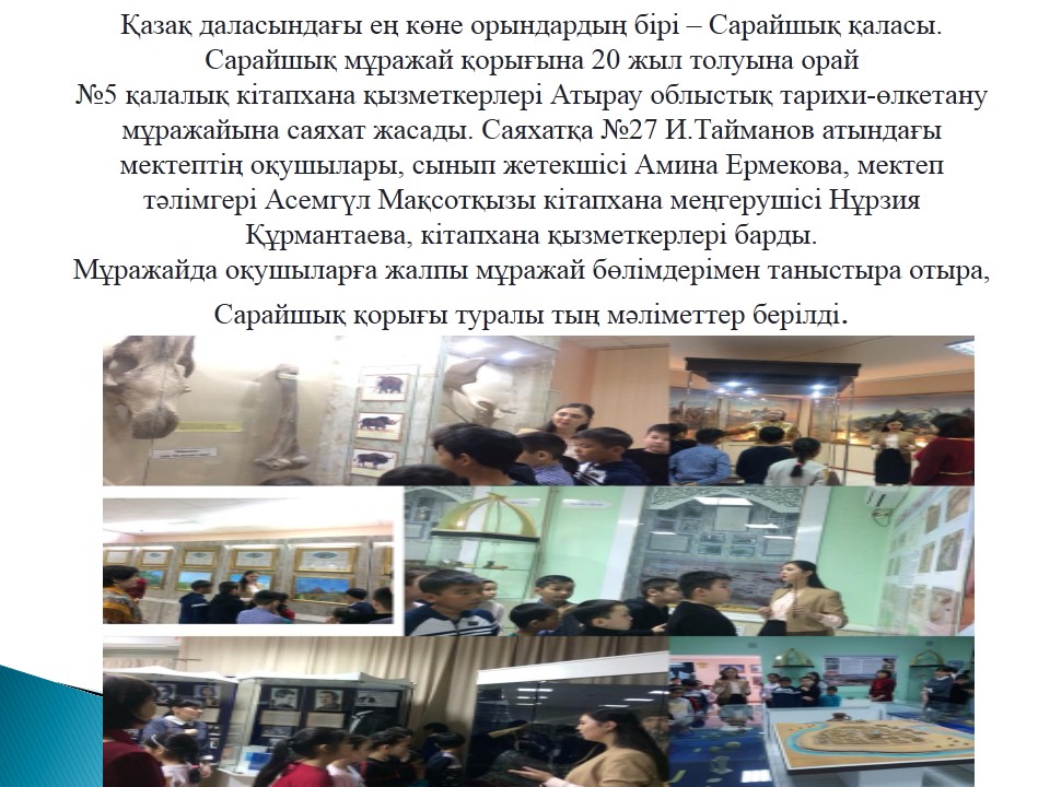 "Тарихи тұлғалар тағылымы" жобасы аясында Атырау қаласы N27 И.Тайманов атындағы орта мектебінің 5-6 сынып оқушылары қазақ даласындағы ең тарихи орындардың бірі "Сарайшық" мемлекеттік тарихи-мәдени мұражайға барып, туған жердің тарихы мен тарихи жәдігерлерімен танысып, рухани демалып қайтты.