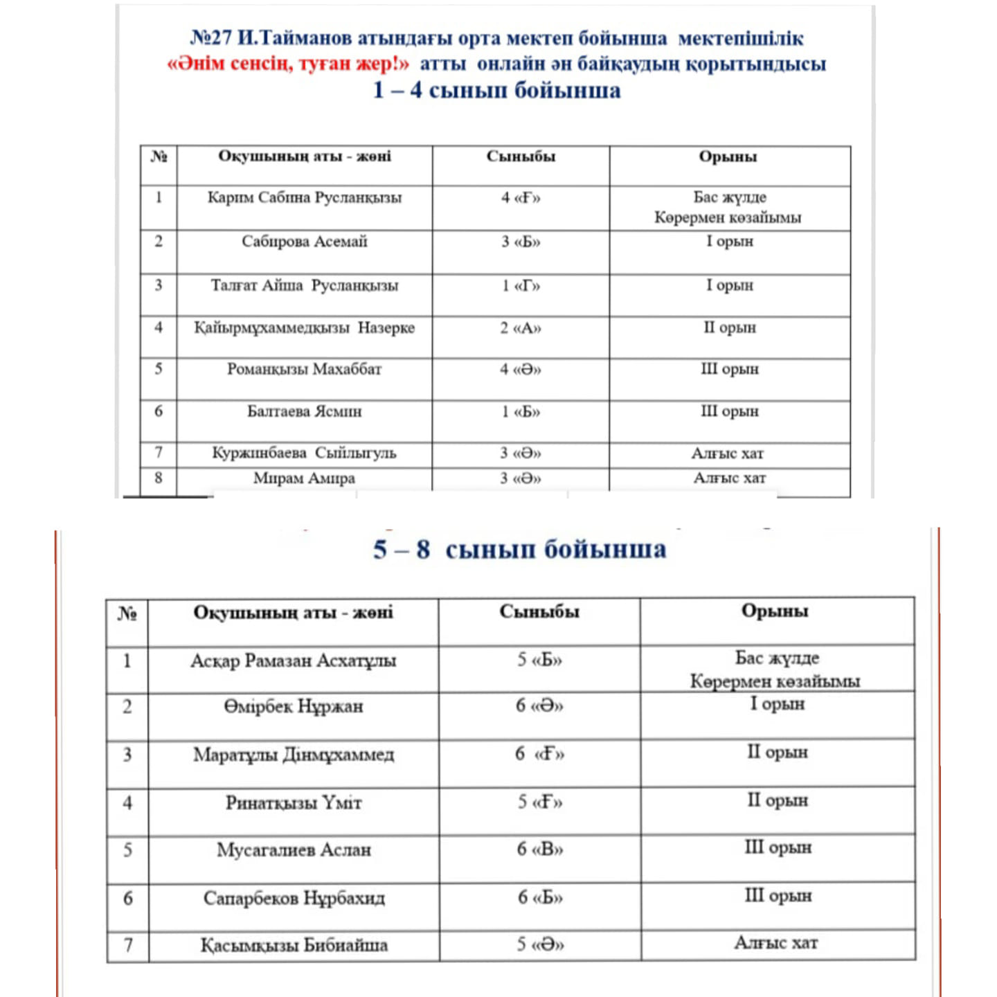 ММ “ЖАЛПЫ БІЛІМ БЕРЕТІН №27 И.ТАЙМАНОВ АТЫНДАҒЫ ОРТА МЕКТЕБІ”