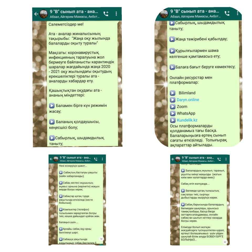 Жиналыста оқу жылындағы оқу форматтары, оқытудың штаттық режимінде санитарлық талаптарды сақтау, қашықтан оқытудағы баланың іс-әрекеттері, интернетті қауіпсіз пайдалану ережелері, білім алушыларды бағалау жүйесі және т.б. мәселелер жөнінде ата-аналарға көптеген ақпараттар беріліп, қашықтан оқытуға баланың психологиялық жайлылығына арналған кеңестер берілді.