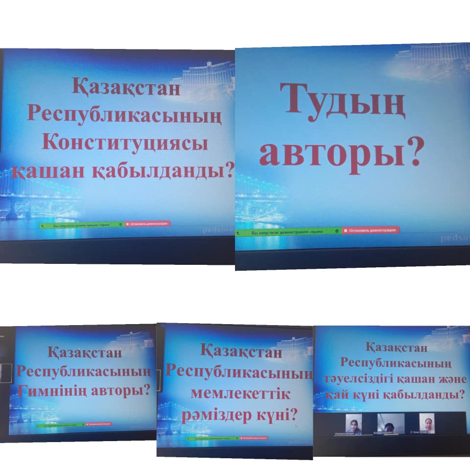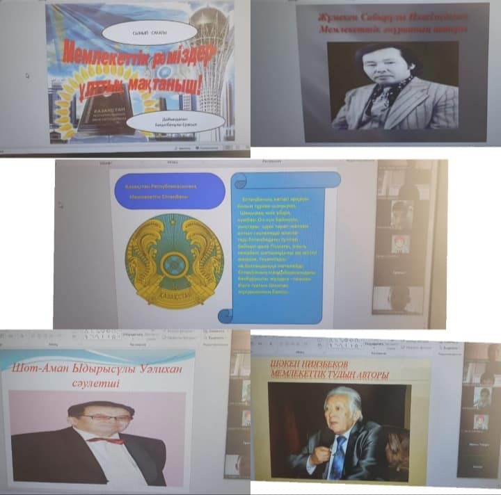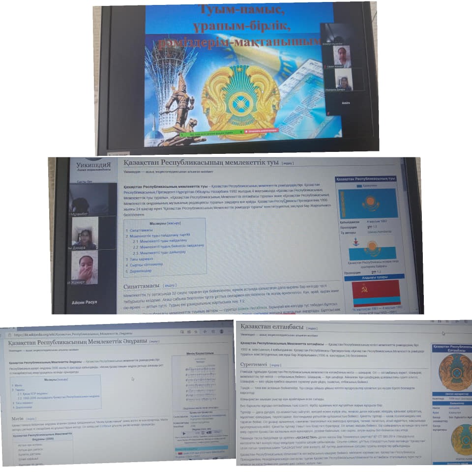 2020 жылдың 12 – 16 қазан аралығының апталық жоспарына сәйкес, Қазақстан Республикасының Рәміздері туралы түсініктерін қалыптастыру. Оқушыларды Отансүйгіштікке, адамгершілікке, Отанына, халқына адал қызмет етуге, елінің Туын, Елтаңбасын, Әнұранын қастерлеуге, халқының тегін, тарихын білуге тәрбиелеу мақсатында сыныптарда "ZOOM" платформасы арқылы онлайн режимінде сынып сағаттары ұйымдастырылды.