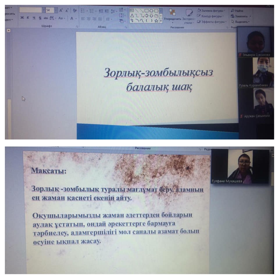 Сонымен қатар, ағымдағы жылдың 3 желтоқсан күні Атырау қаласы №27 И.Тайманов атындағы орта мектептің 9 сынып оқушыларымен педагог ұйымдастырушы Э.Суесинова, директордың тәрбие ісі жөніндегі орынбасары Г.Мукашева, мектеп инспекторы, полиция лейтенанты Гузель Құрманқызы "Зорлық-зомбылықсыз балалық шақ" тақырыбында онлайн режимінде «ZOOM» платформасы арқылы түсіндірме жұмыстарын жүргізді, соңында оқушылардың сұрақтарына жауап берді.