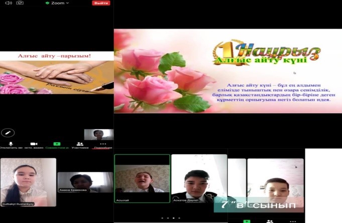 1 наурыз - Алғыс айту күніне орай  кезекші  5 сынып оқушыларының қатысуымен "Алғыс айту - парызым!" тақырыбында санитарлық талаптарды сақтай отырып лездеме ұйымдастырылды.  Сонымен қатар сыныптарда  сынып сағаттары өтті.