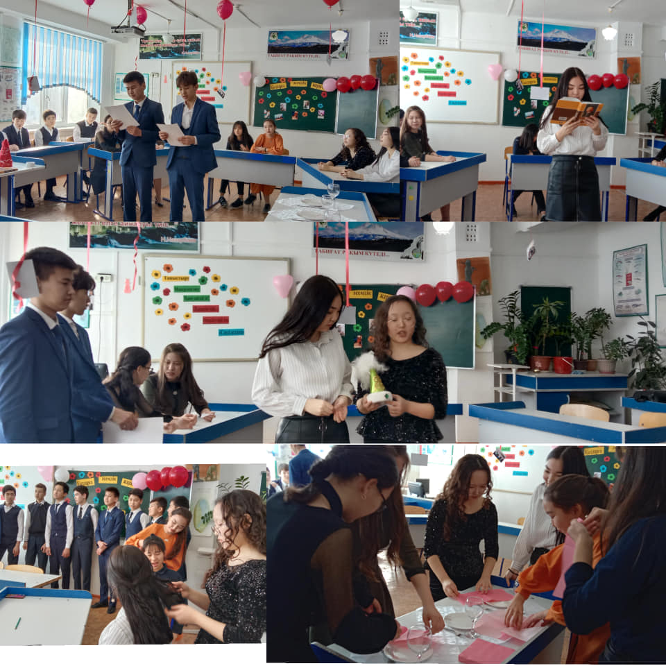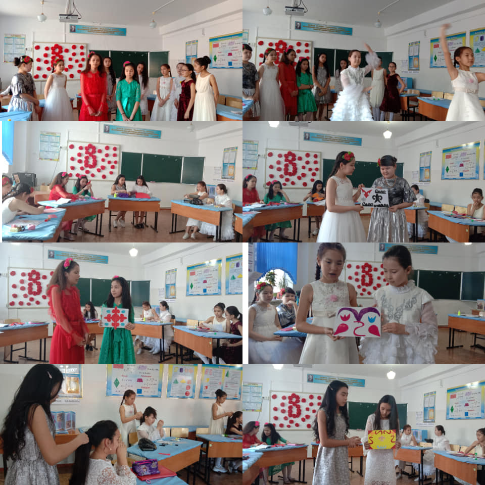 02.03-06.03 күні аралығында 8 наурыз мерекесіне арналған “Қыздарға әсемдік жарасады” апталығы аясында дәлізде көрме жасақталып, сыныптарда сынып сағаттары өтті. Қыздарға қырық үйден тыйым ұғымдарының мәнін ашу;қыздарды инабаттылыққа, сыпайылыққа,әдептілікке тәрбиелеу мақсатында қыздар ұйымының жетекшісі К.Жумагалиева ұйымдастыруымен 8 сынып қыздарының қатысуымен “Қызға қырық үйден тыйым” атты сырласу сағаты ұйымдастырды. “Қызға қырық үйден тыю, ұлға отыз үйден тыю” мақалына түсінік жұмысын жүргізіп, қыздармен пікір алмасты.
