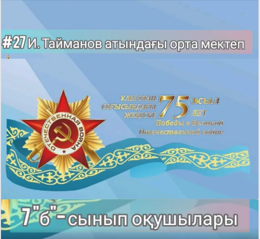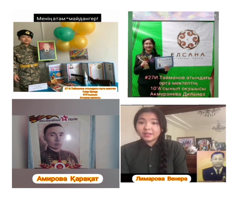 Ұлы Жеңістің 75 жылдығына орай Nur Otan партиясының «Ардагерлерді ардақтайық» жобасы аясында ҰОС мен тыл ардагерлеріне құрмет көрсету мақсатында мектебіміздің оқушылары соғысқа қатысқан аталарының өмір жолы мен соғыстағы ерен батырлығы туралы Менің атам майдангер” тақырыбында онлайн бейнежазба дайындап мәлімдеді.