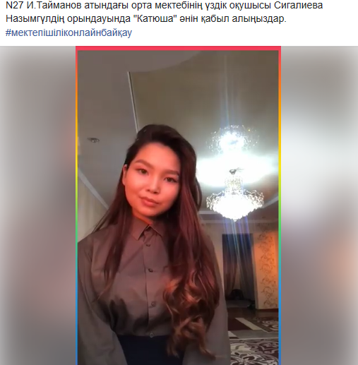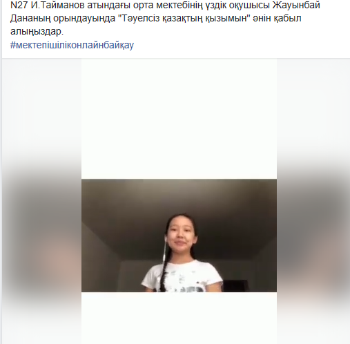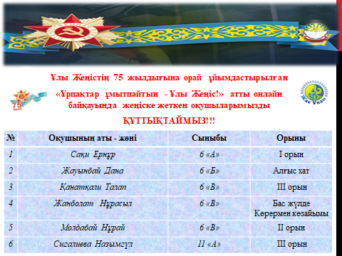 Ұлы Жеңістің 75 жылдығына орай ұйымдастырылған “Ұрпақтар ұмытпайтын – Ұлы Жеңіс!” атты мектепішілік онлайнға оқушыларымыз қатысып өнерлерін көрсетіп, марапатталды.